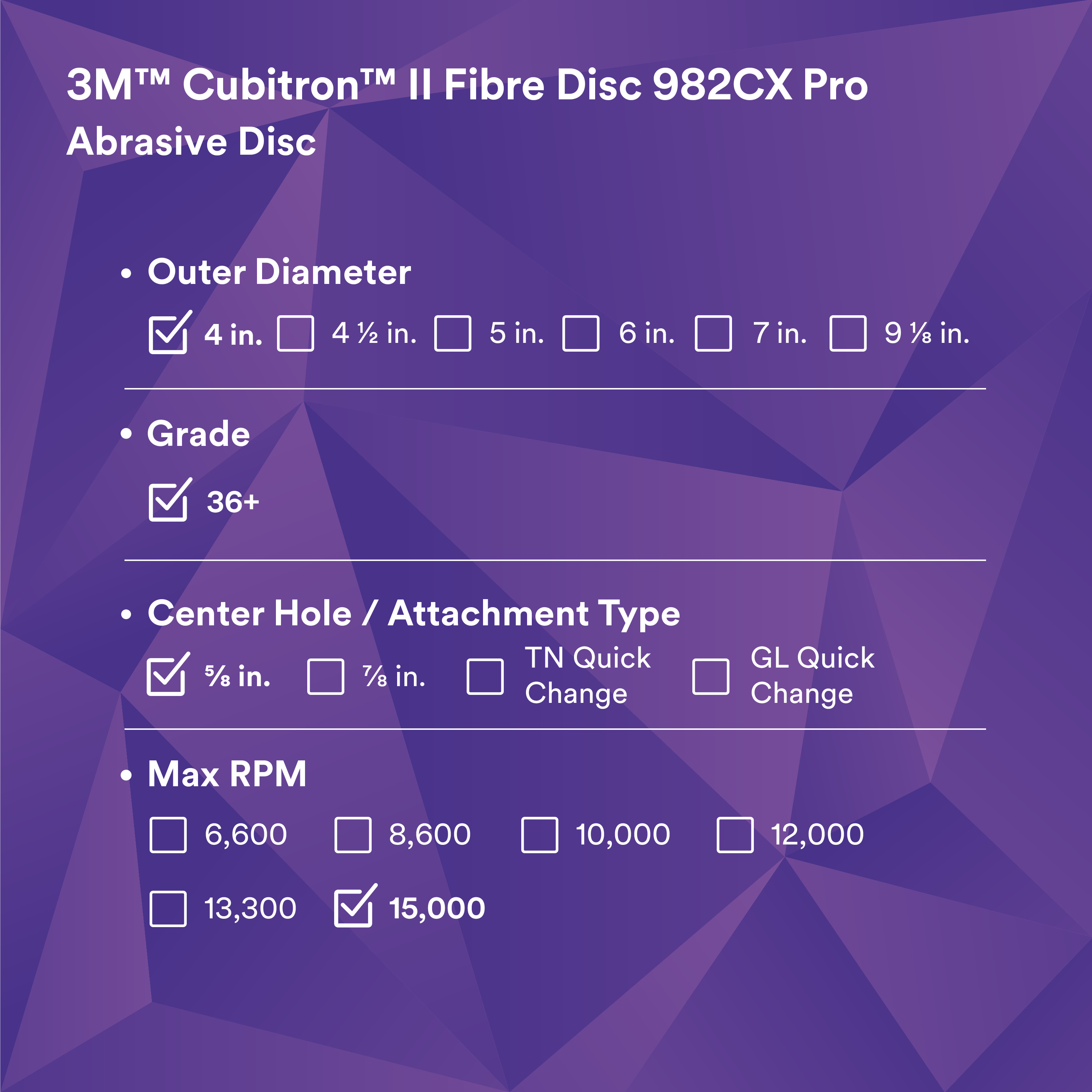 - RE-ENGINEERED 3M PRECISION SHAPED-GRAIN: Allows the 3M Cubitron II Fibre Discs 982CX Pro to provide a 33% higher cut rate and remove 31% more material with a sustained cut compared to 3M Cubitron II Fibre Disc 982C
