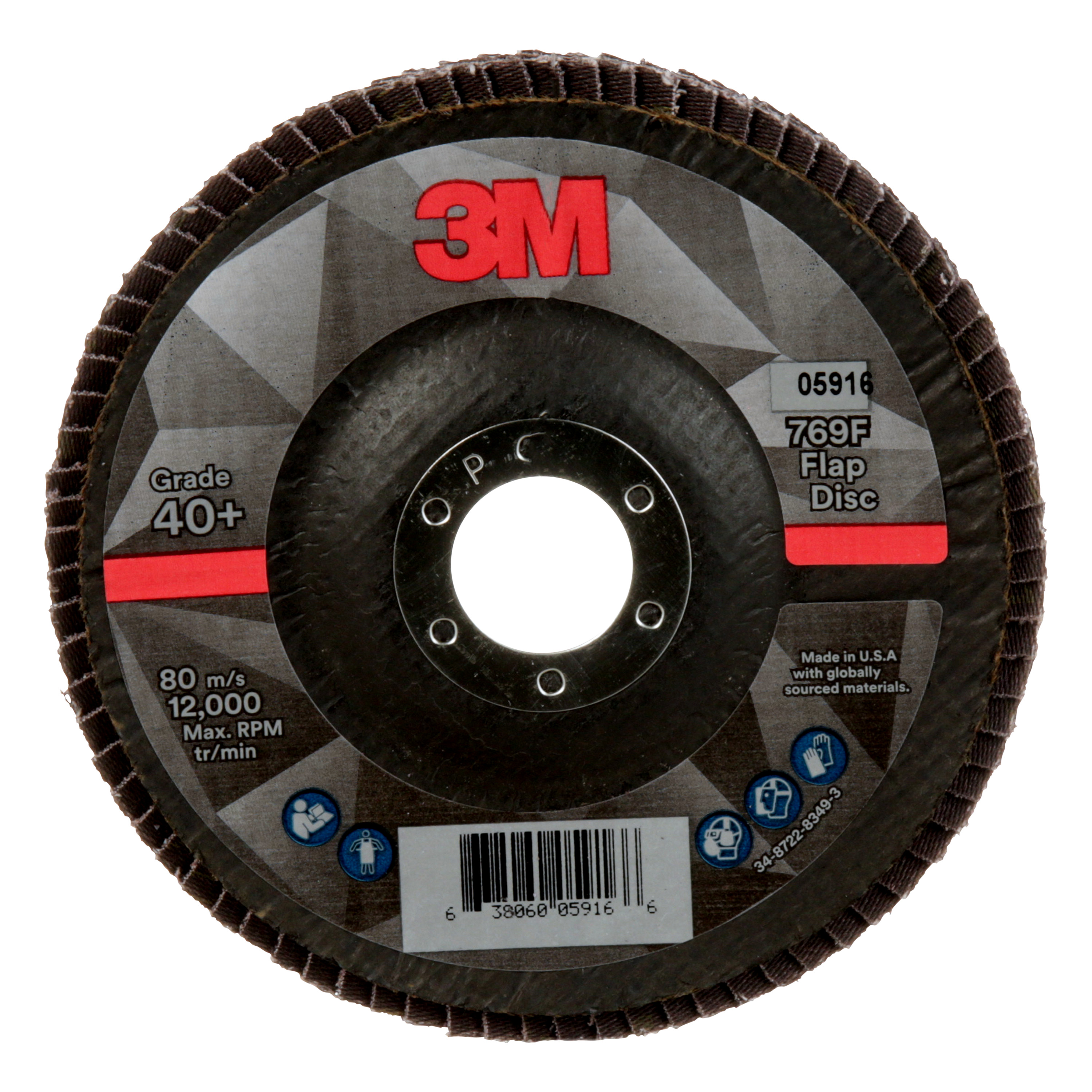 The 3M™ Flap Disc 769F features a blend of 3M Precision-Shaped Grain – a proprietary 3M grain design that continually fractures into sharp points that slice cleanly through metal, unlike traditional abrasives which tend to plow through the substrate. This fracturing helps 3M™ Flap Disc 769F last long and maintain a high cut-rate over the life of the disc.