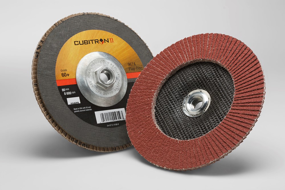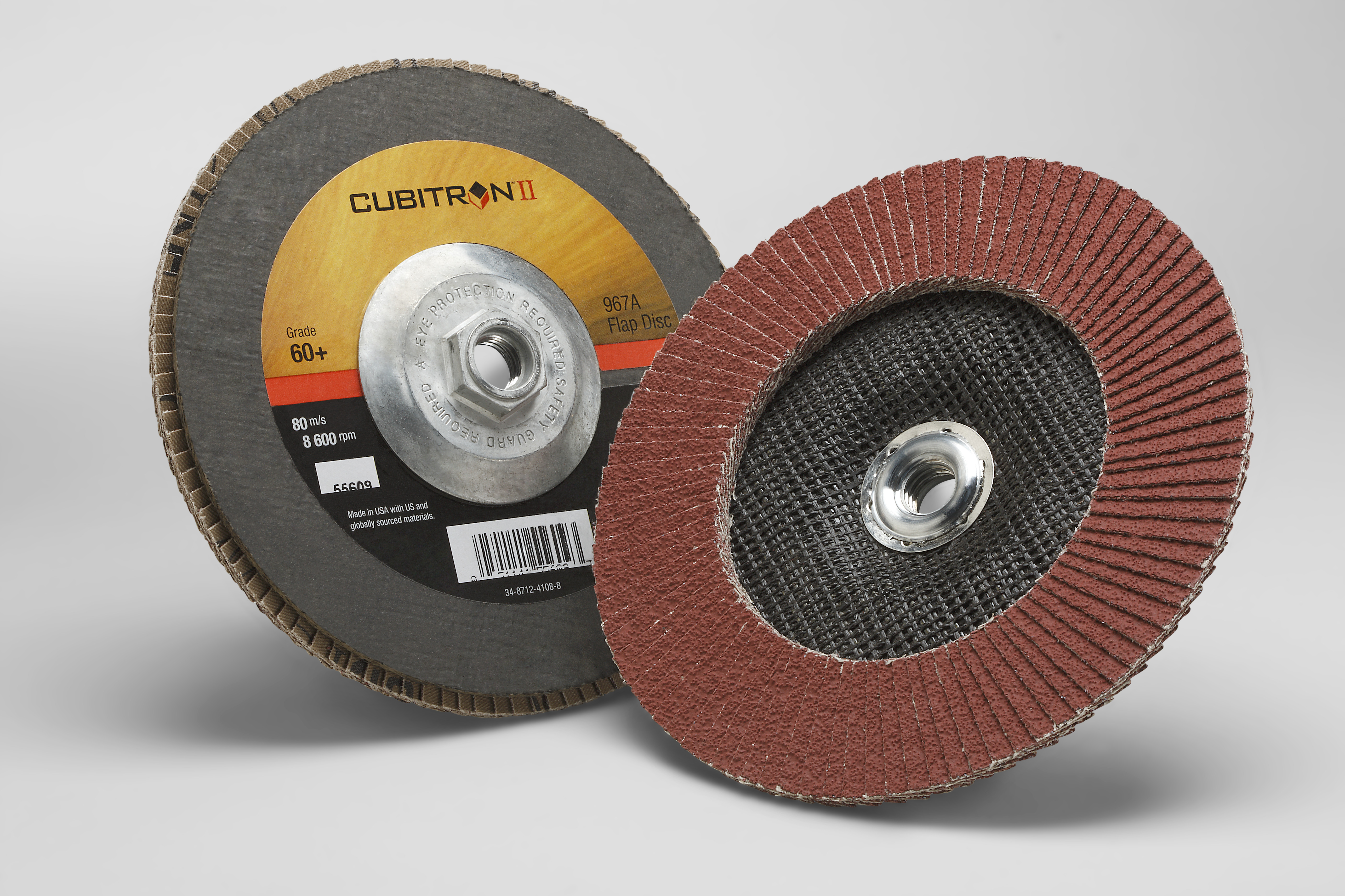 The Anatomy of a Versatile, Medium-Duty Disc3M™ Cubitron™ II Flap Disc 967A – powered by 3M Precision-Shaped Grain and a poly-cotton backing – is well-suited for medium-duty applications including weld, scale and oxide removal, light deburring, surface preparation and blending. Along with the poly-cotton backing, this disc also features an incorporated grinding aid to help it run cool and cut efficiently on heat-sensitive metals. This all adds up to a disc that strikes a balance of fast cut and long life. Flap Disc DesignFlap discs are the ideal choice for a wide range of applications on a variety of metals. The abrasive flaps offer a long-lasting supply of fresh abrasives in a load-resistant design. Designed for use with a right-angle grinder, flap discs allow you to breeze through a wide range of applications with less chance of gouging – even for less-experienced grinders. Powered by 3M Precision-Shaped Grain3M™ Cubitron™ II Flap Disc 967A features proprietary 3M Precision-Shaped – a grain design that continually fractures into sharp points that slice cleanly through metal, unlike traditional abrasives which tend to plow through the substrate. The grains fracture evenly and continuously expose new sharp edges to keep the disc cutting efficiently. The result is that 3M™ Cubitron™ II products out-cut and outlast conventional ceramic industrial abrasives. Applications