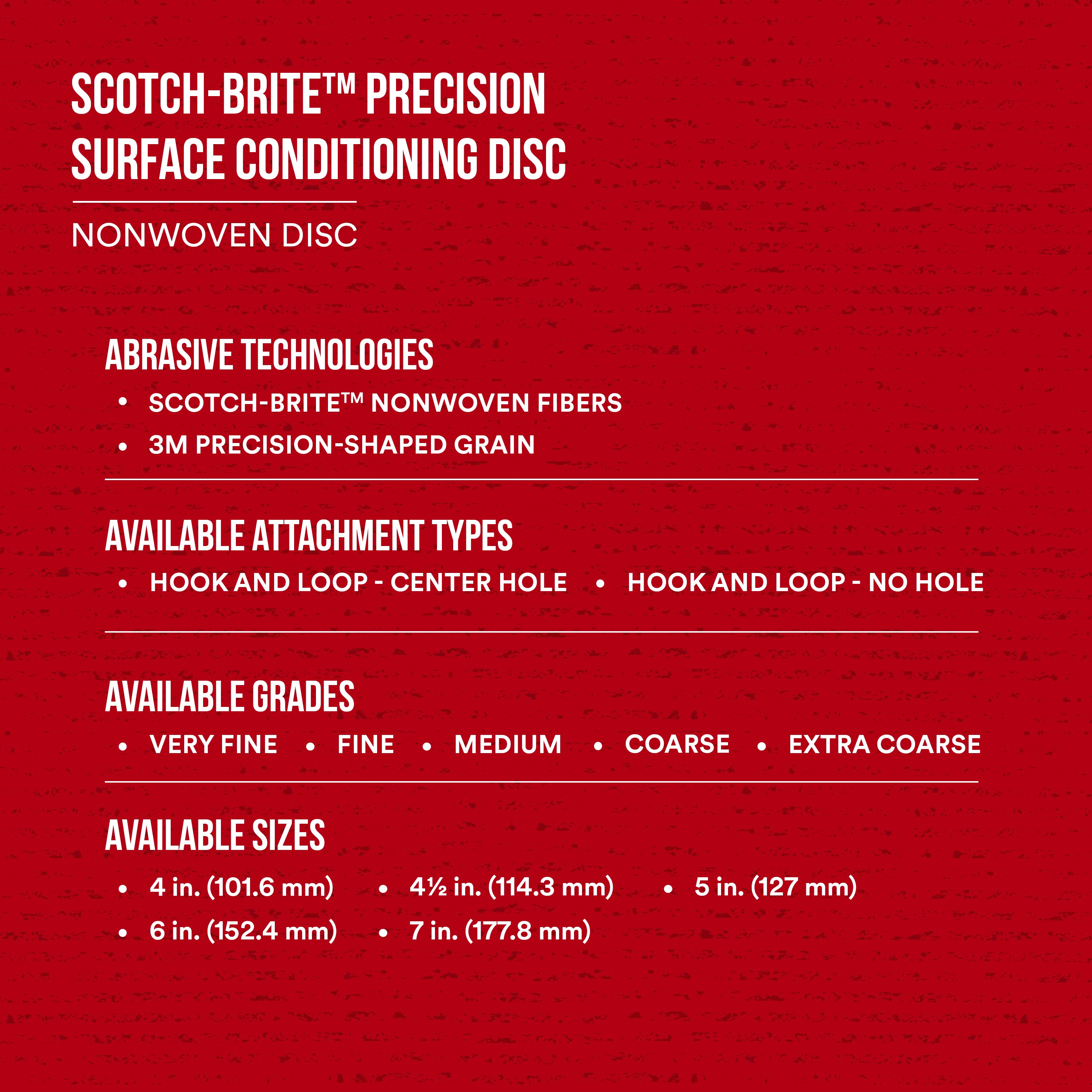 Redesigned with you in mind. Meet the next advancement in surface conditioning technologies: Scotch-Brite™ Precision Surface Conditioning Discs. This new addition to the Scotch-Brite™ lineup promises the consistency you’ve come to expect with increased cutting speed and longer abrasive life. By combining two flagship 3M technologies — nonwoven fibre and ceramic 3M Precision-Shaped Grain — you can get the ideal finish, faster. To help you be even more efficient, these discs come in brighter, more vivid colors to make identification easier. Plus, the grade range has been expanded to include Fine and Extra Coarse offerings, providing an even larger range of solutions for your abrasive needs. Ready to improve your process. These premium multi-purpose discs are designed to streamline surface conditioning processes including cleaning, blending, deburring and finishing. Typical substrates include aluminum and soft metals, carbon steel and stainless steel, with applications ranging from coating and corrosion removal to refining and post-cast processing. Applications Coating removal Corrosion removal Refining coated abrasive scratches Refining machine marks Post-cast processing Burr removal Removing micro-burrs
