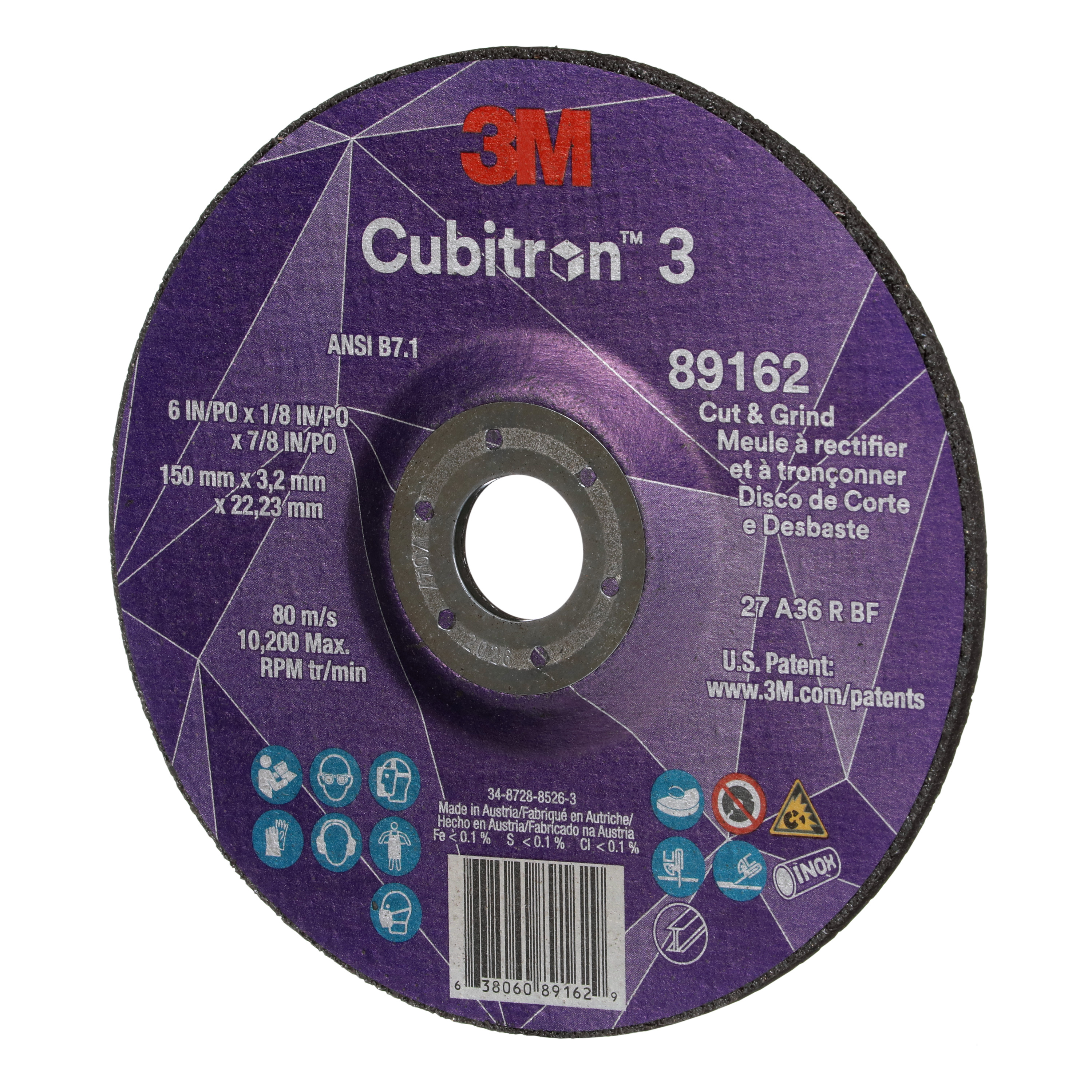 All Products>Abrasives>3M™ Cubitron™ 3 Cut and Grind Wheel, 89162, 36+, T27, 6 in x 1/8 in x 7/8 in (150 x 3.2 x 22.23 mm), ANSI, 10/Pack, 20 ea/Case
