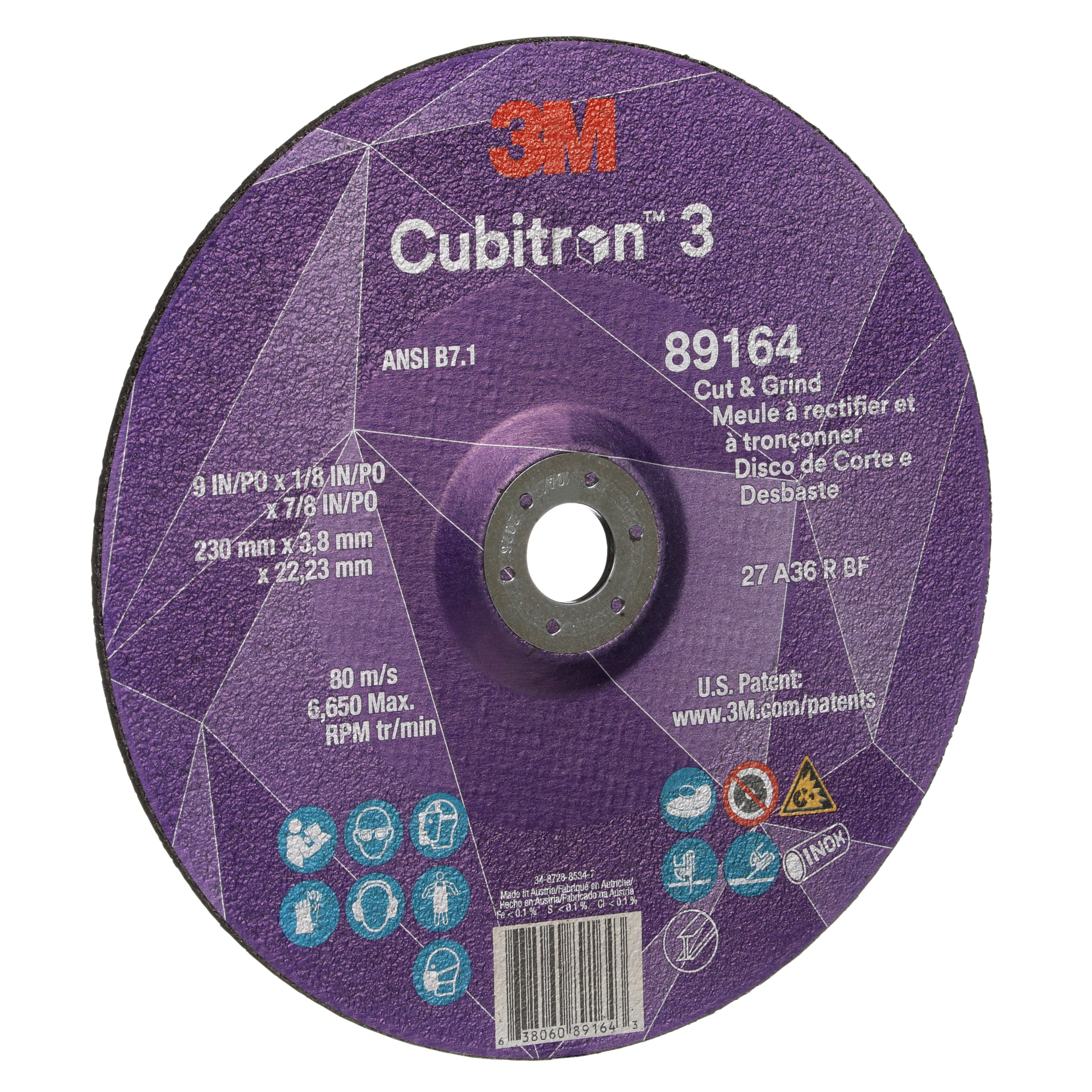 All Products>Abrasives>3M™ Cubitron™ 3 Cut and Grind Wheel, 89164, 36+, T27, 9 in x 1/8 in x 7/8 in (230 x 3.2 x 22.23 mm), ANSI, 10/Pack, 20 ea/Case