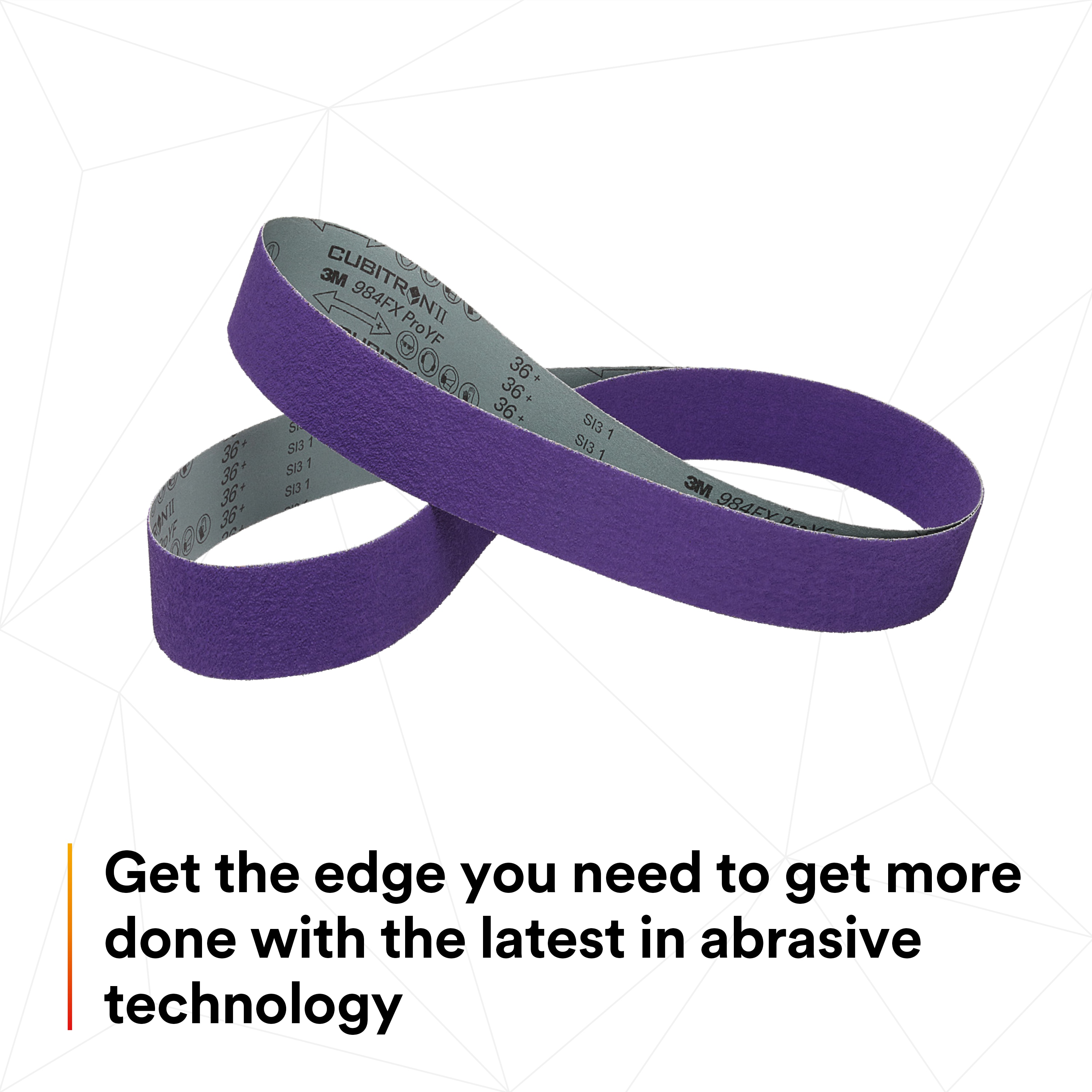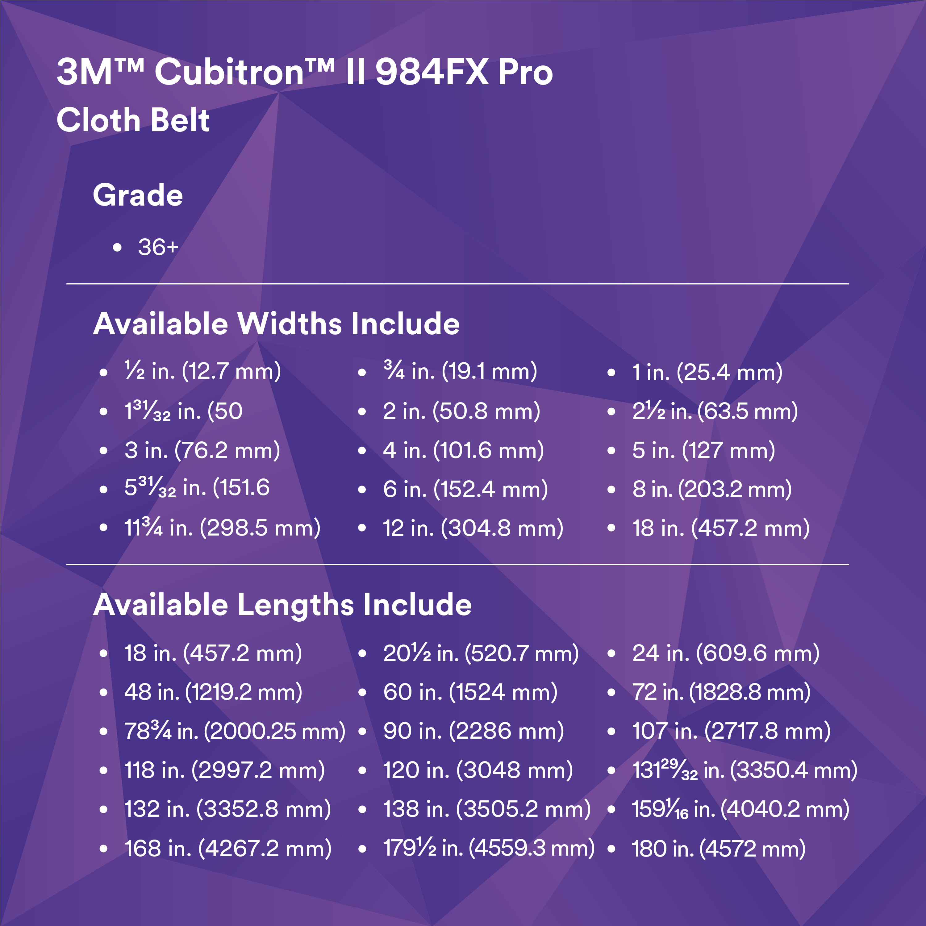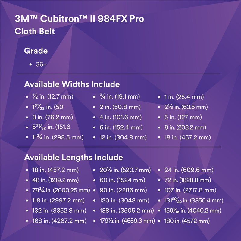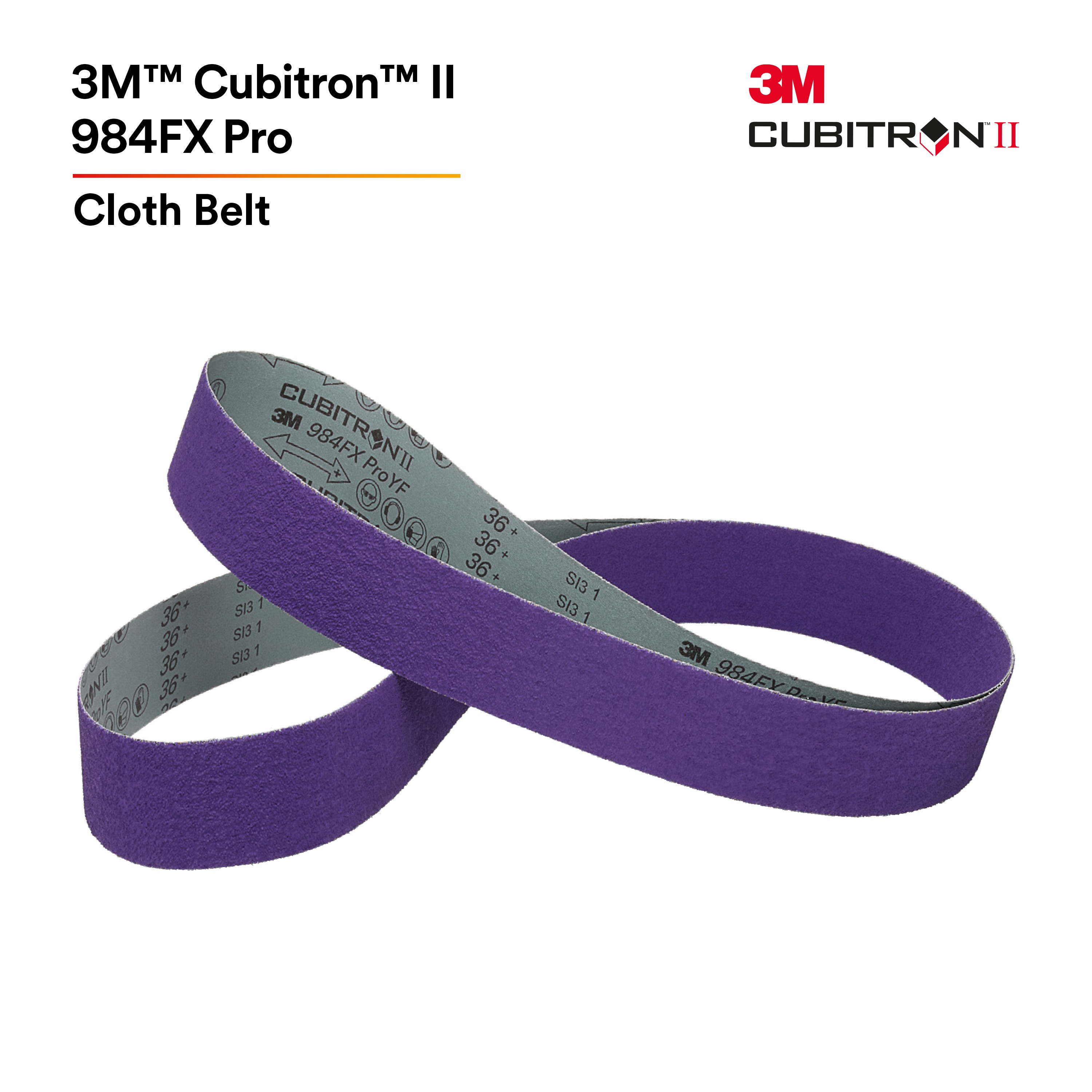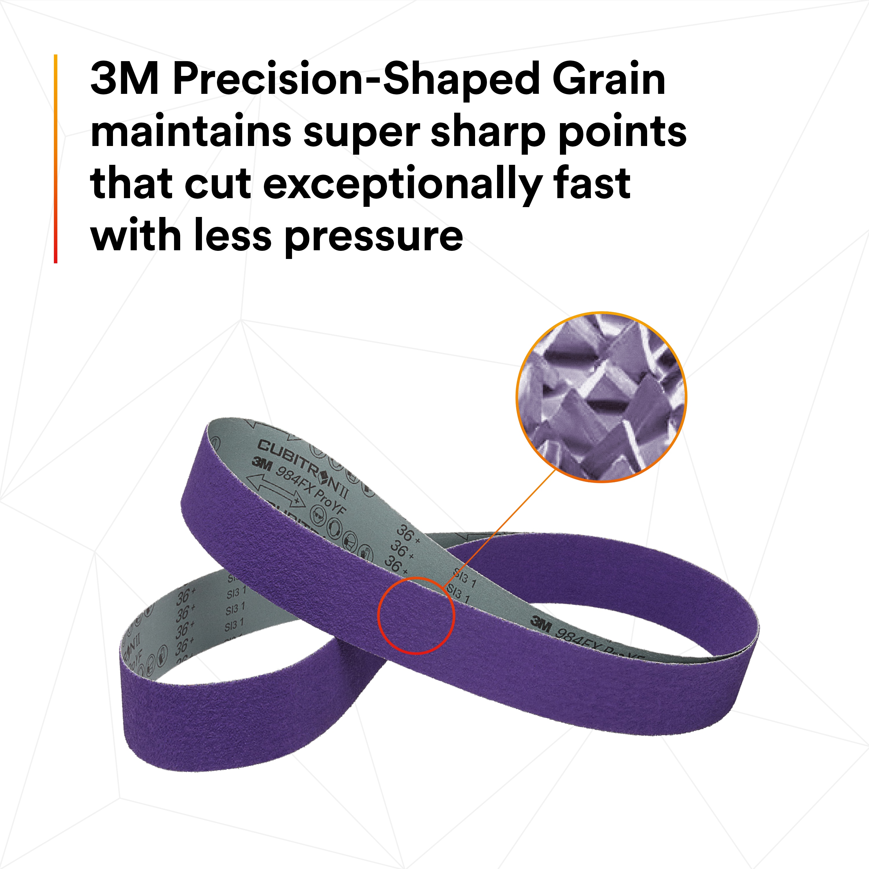 Optimize Your Outcomes with Re-Engineered Grain Development of the 3M™ Cubitron™ II Cloth Belt 984FX Pro included a reformulation of the groundbreaking technology behind 3M™ Cubitron™ II Abrasives. This new re-engineered 3M Precision-Shaped Grain cuts even faster and last even longer, helping you boost productivity in your operation.