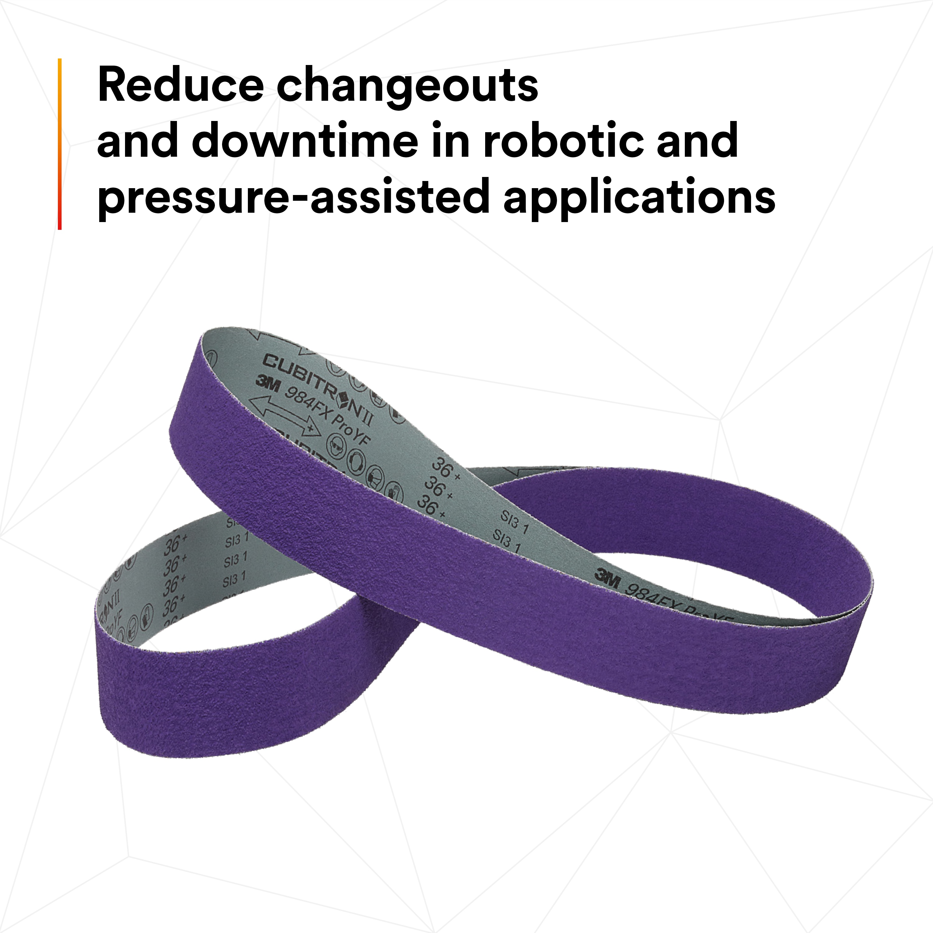 Maximize Efficiency in Your Robotic Cell Automated grinding processes are only as efficient as the abrasives they use. Leading robotic system integrators around the world spec-in 3M™ Cubitron™ II belts for their legendary performance and ability to reduce downtime. The re-engineered ceramic shaped grain in 3M™ Cubitron™ II Cloth Belt 984FX Pro keeps robots grinding welds and bevels, maximizing efficiency long after other belts require a change-out.
