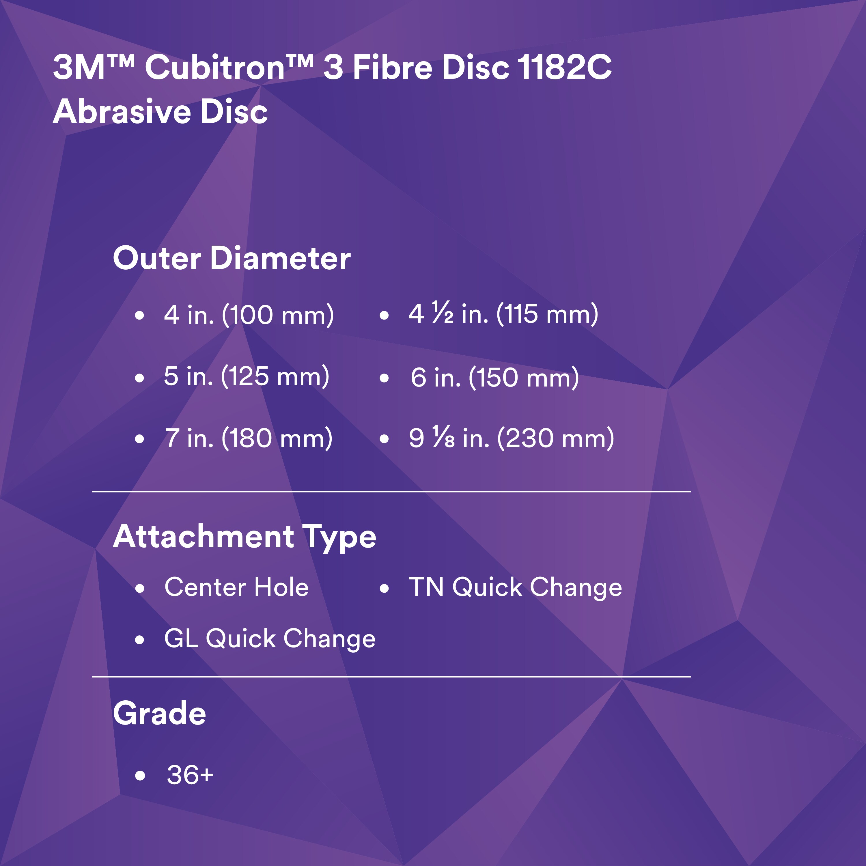 All Products>Abrasives>3M™ Cubitron™ 3 Fibre Disc 1182C, 60+, TN Quick Change, 5 in, Die 500P, 25/Bag, 100 ea/Case