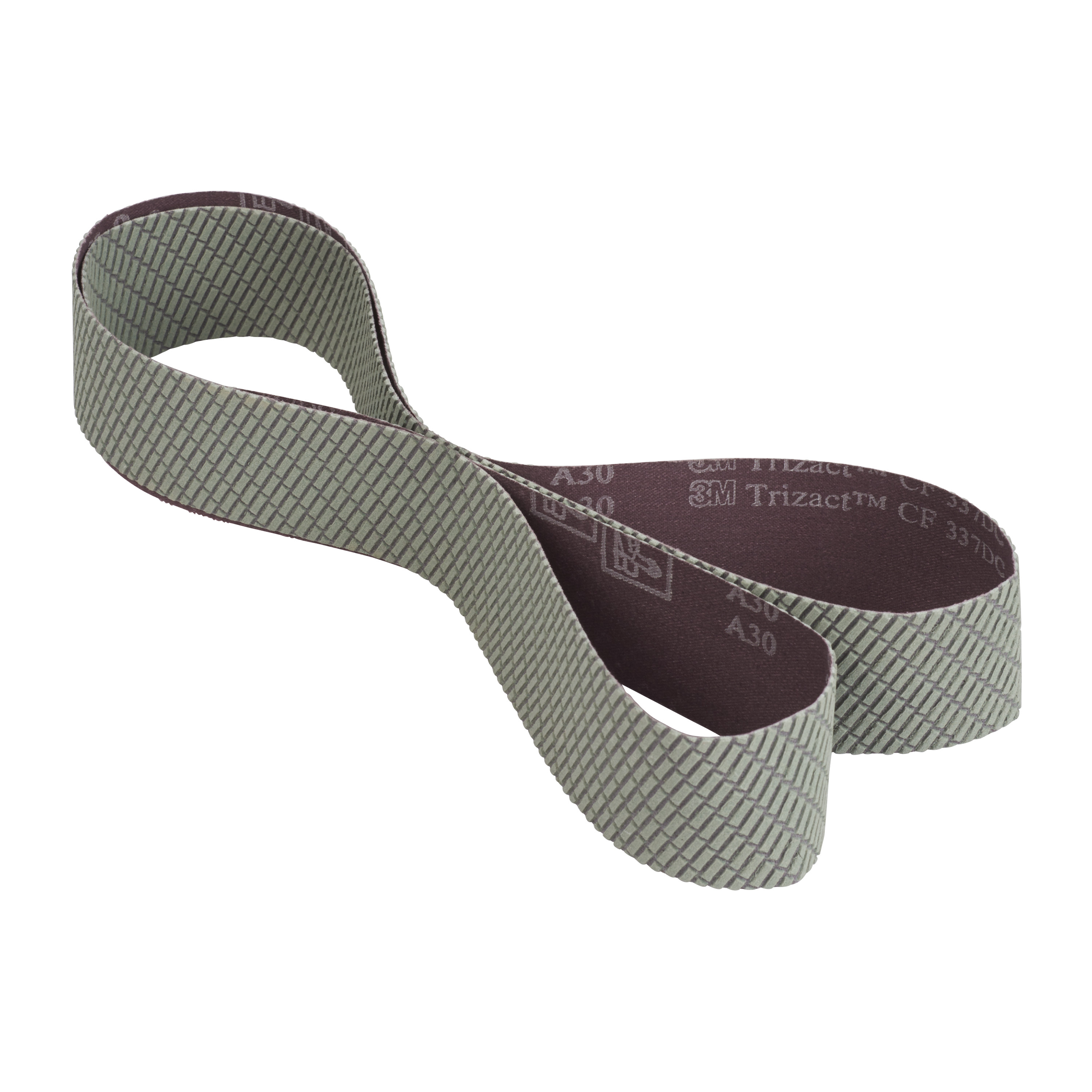 The 3M™ Trizact™ Cloth Belt 337DC owes its durability and consistent sustained cut rate to its uniquely engineered "bricks and channels" macroreplicated abrasive structure. Uniform abrasive "bricks" keep fresh cutting mineral constantly at the working surface and "channels" sweep debris away to discourage loading and keep the substrate clean.