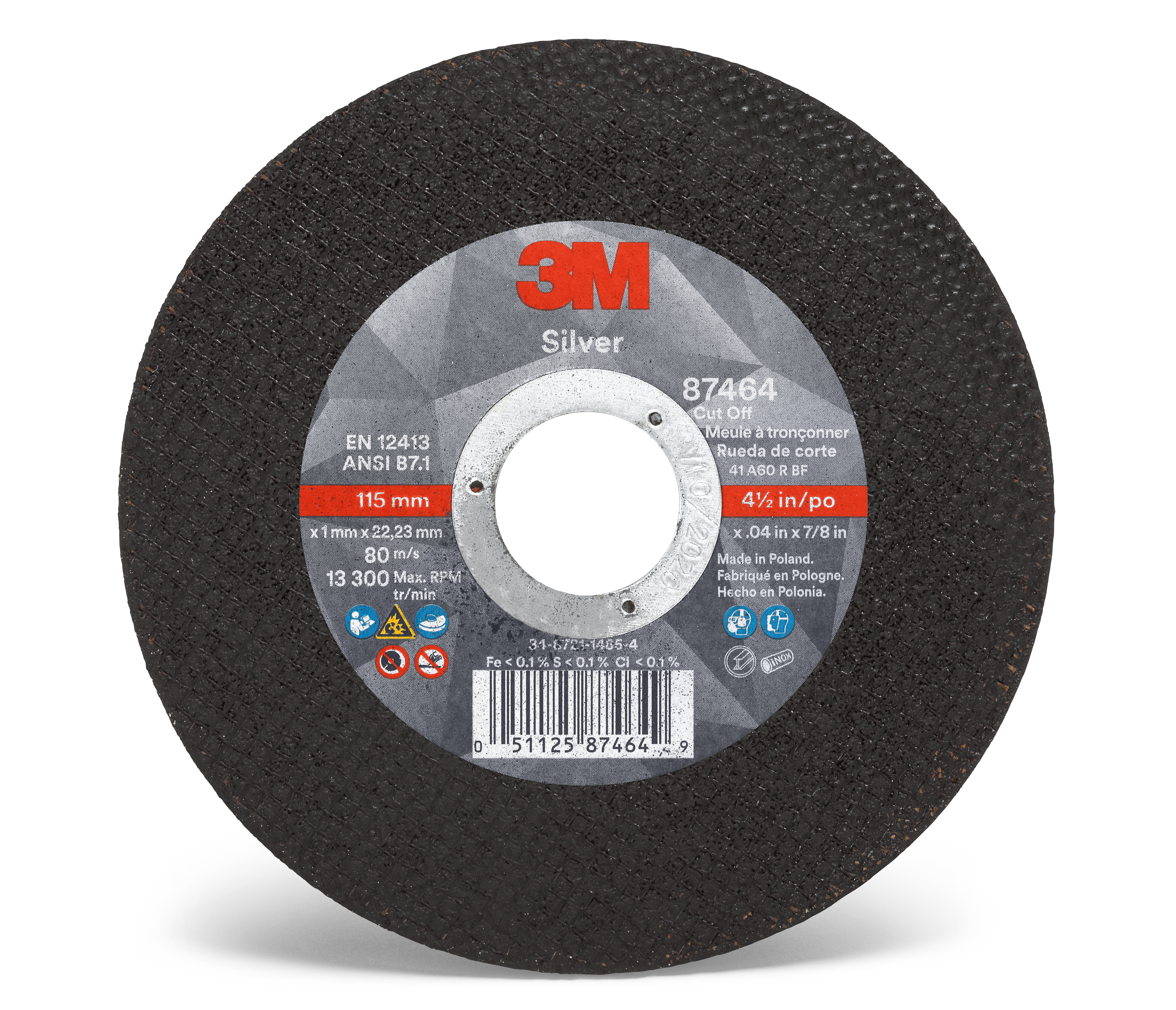 All Products>Abrasives>3M™ Silver Cut-Off Wheel, 87464, 60+, T1, 4.5 in x 0.04 in x 7/8 in, 50 ea/Case