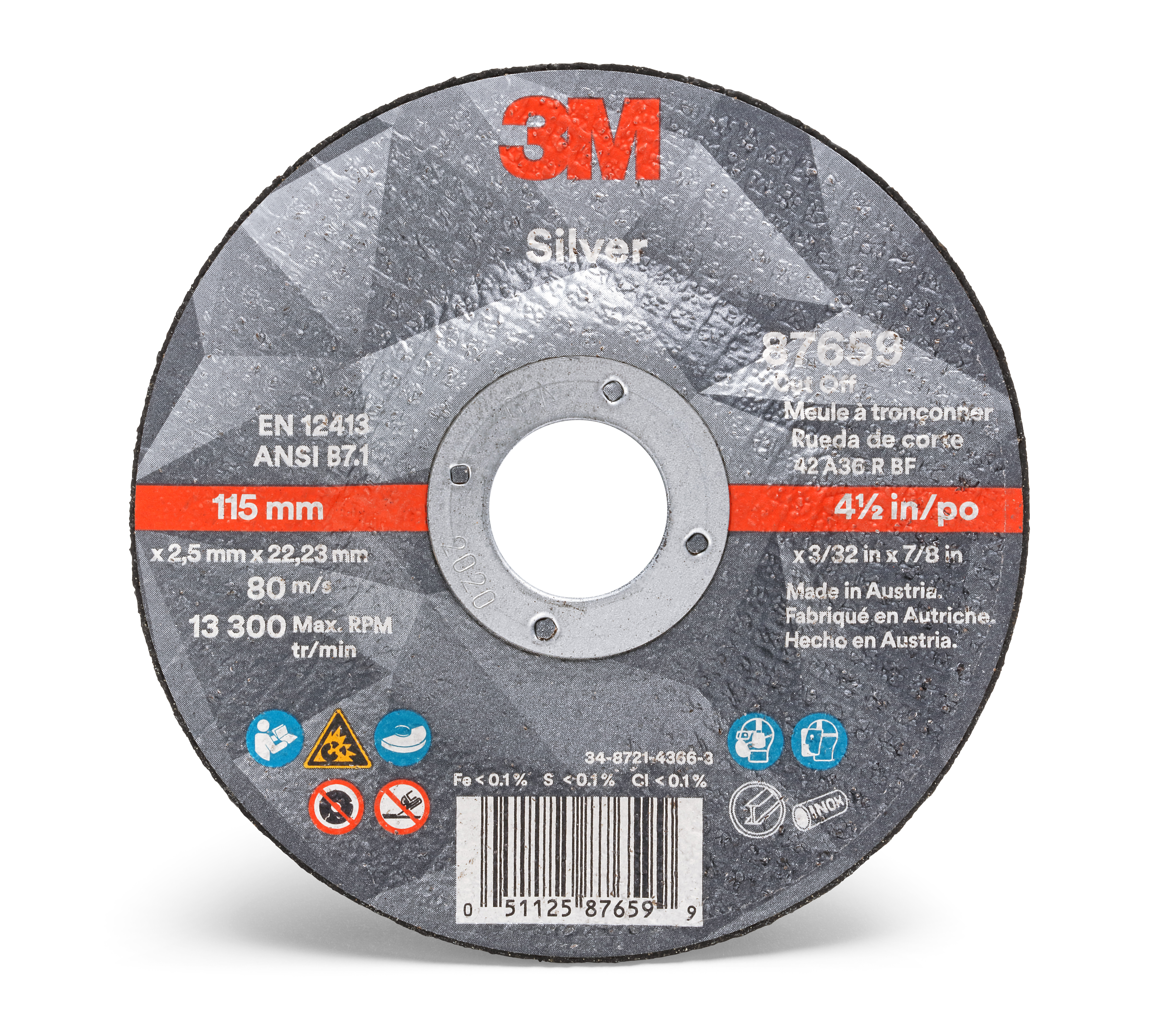 All Products>Abrasives>3M™ Silver Cut-Off Wheel, 87659, 36+, T27, 4.5 in x 3/32 in x 7/8 in, 50 ea/Case
