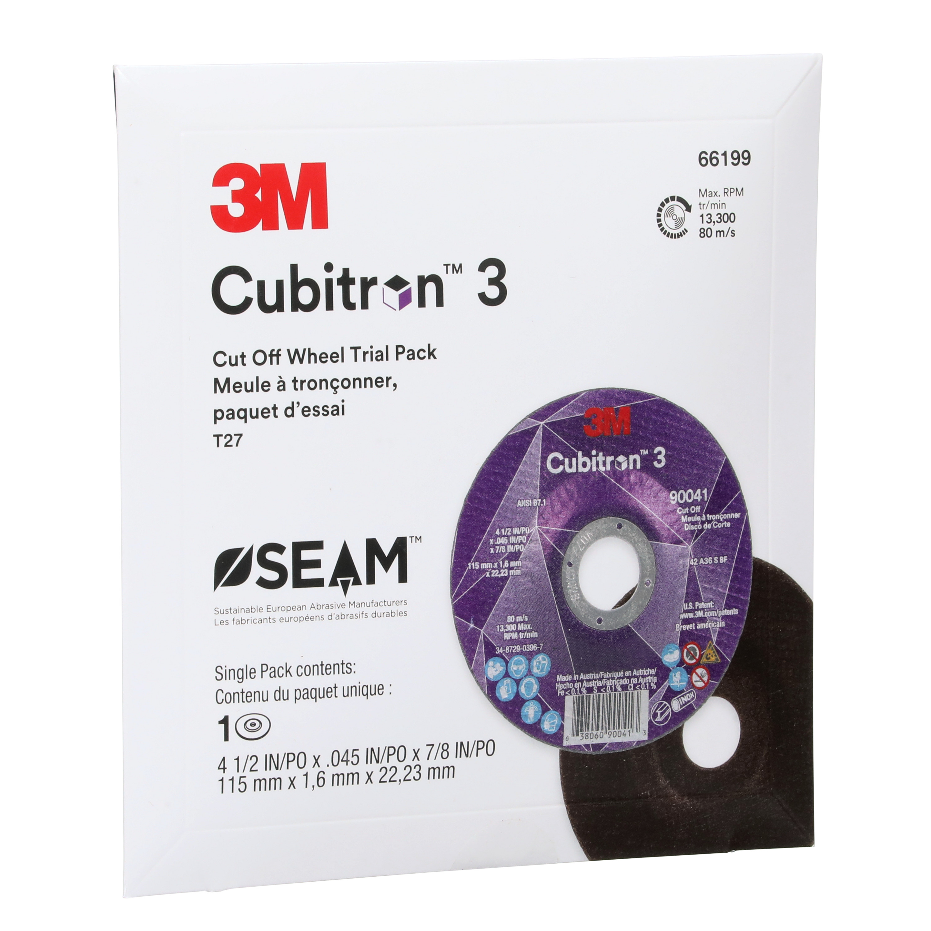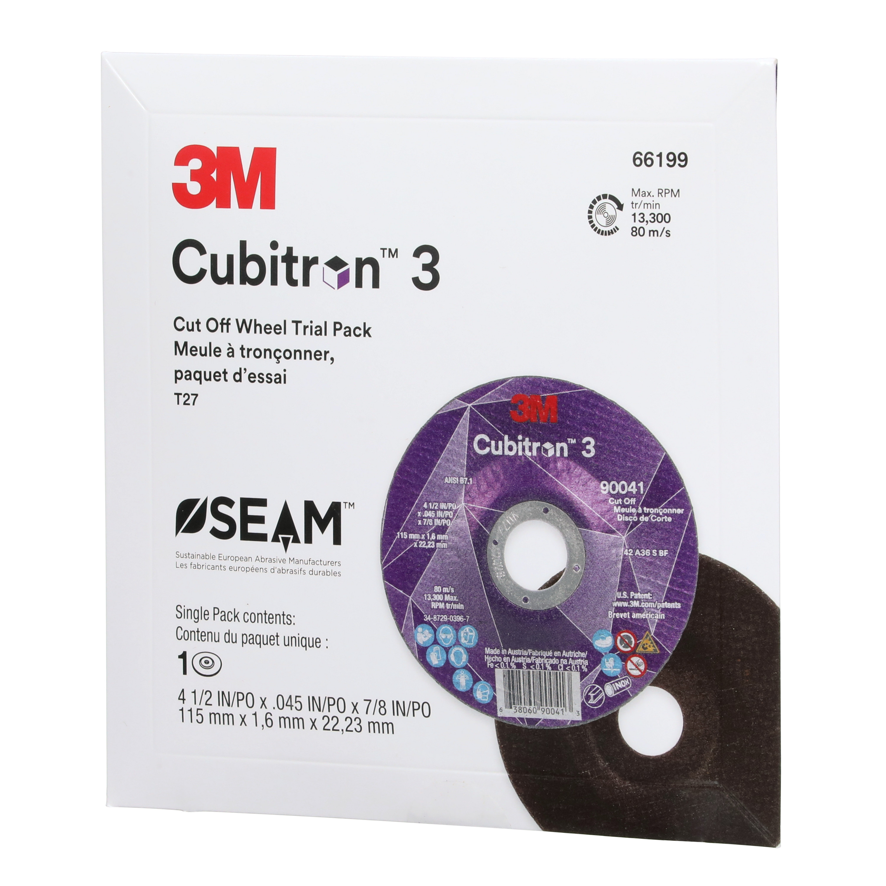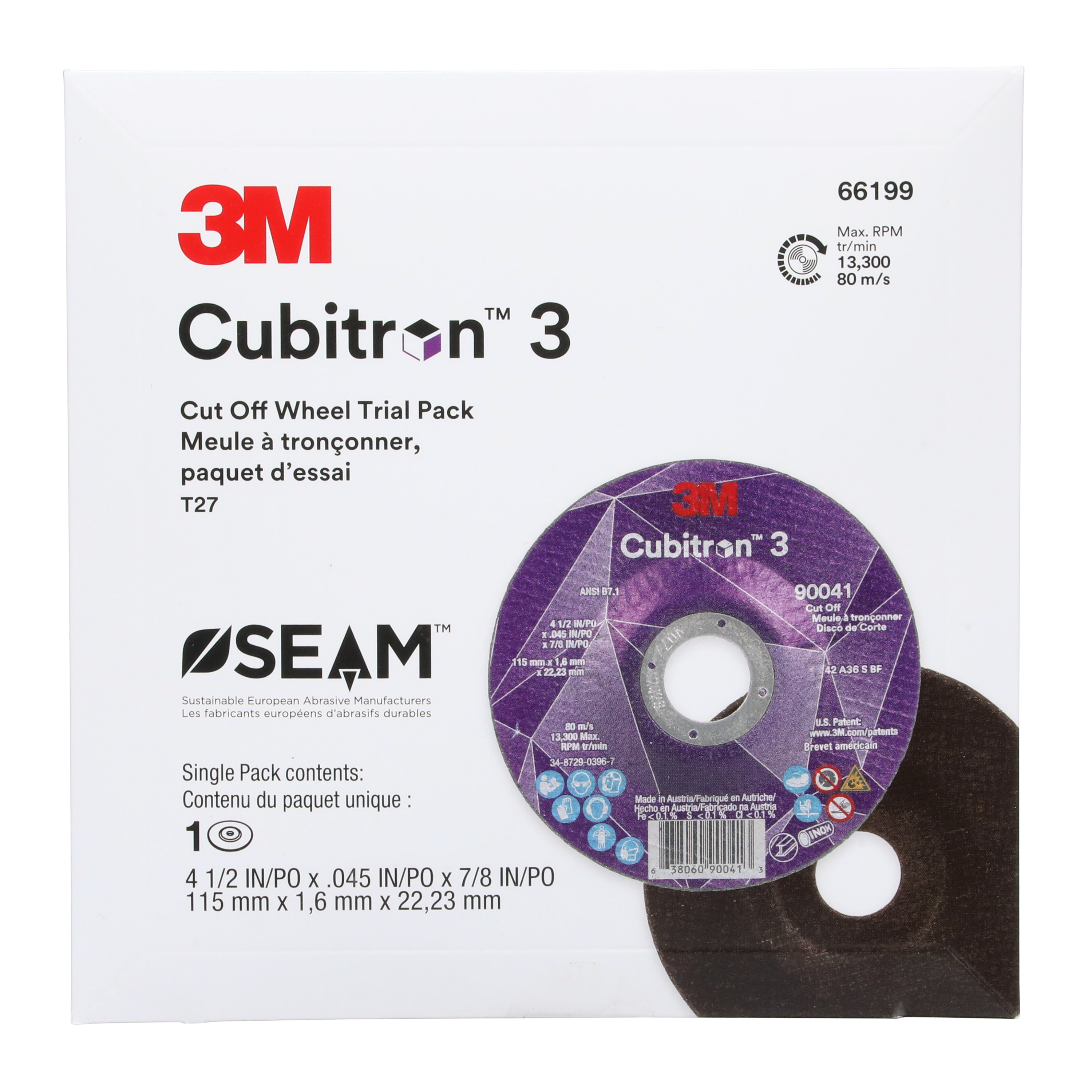 All Products>Brand>3M>Cubitron>3M™ Cubitron™ 3 Cut-Off Wheel, 66199, 36+, T27, 4-1/2 in x 0.045 in x 7/8 in (115mmx1.6mmx22.23mm), ANSI, 10 ea/Case, Trial Pack