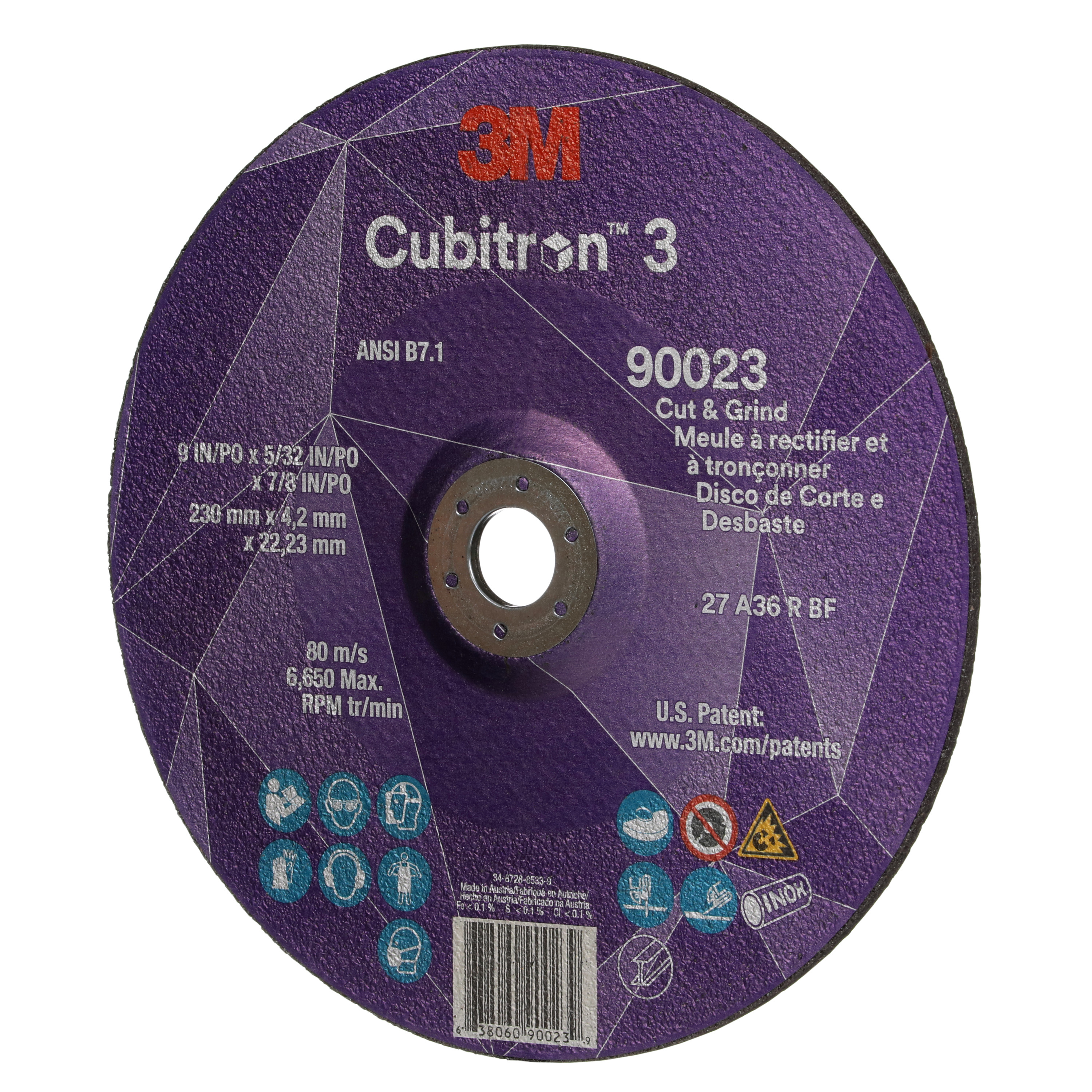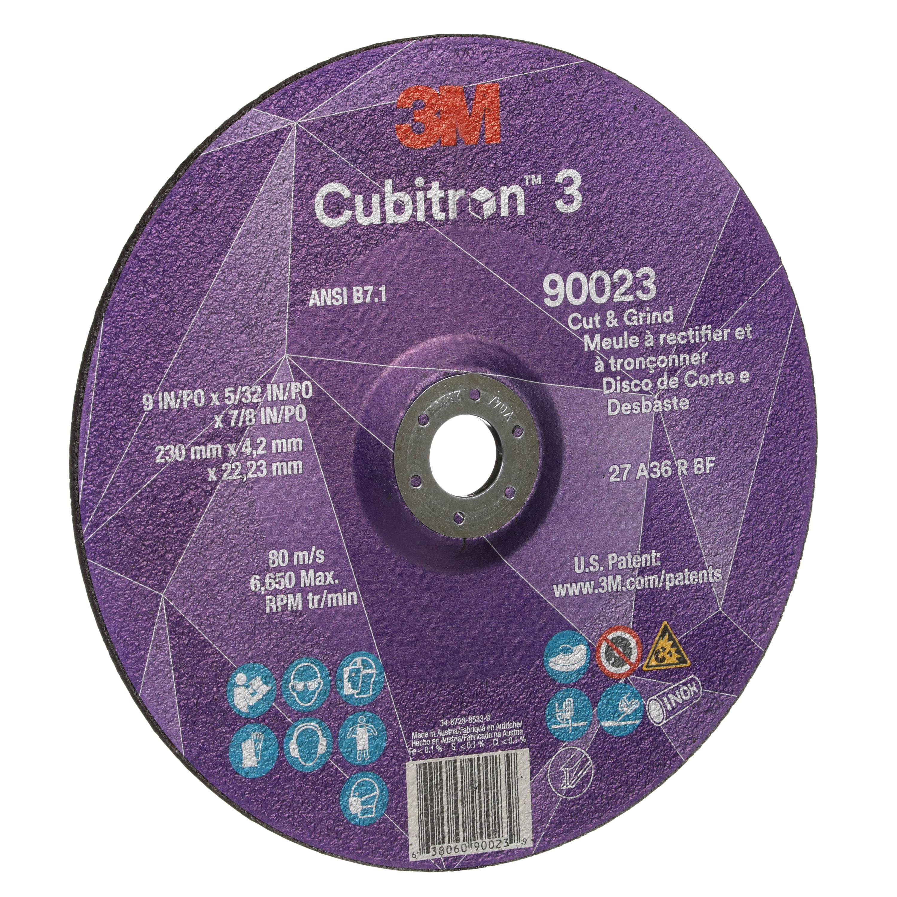 All Products>Abrasives>3M™ Cubitron™ 3 Cut and Grind Wheel, 90023, 36+, T27, 9 in x 5/32 in x 7/8 in (230 x 4.2 x 22.23 mm), ANSI, 10/Pack, 20 ea/Case