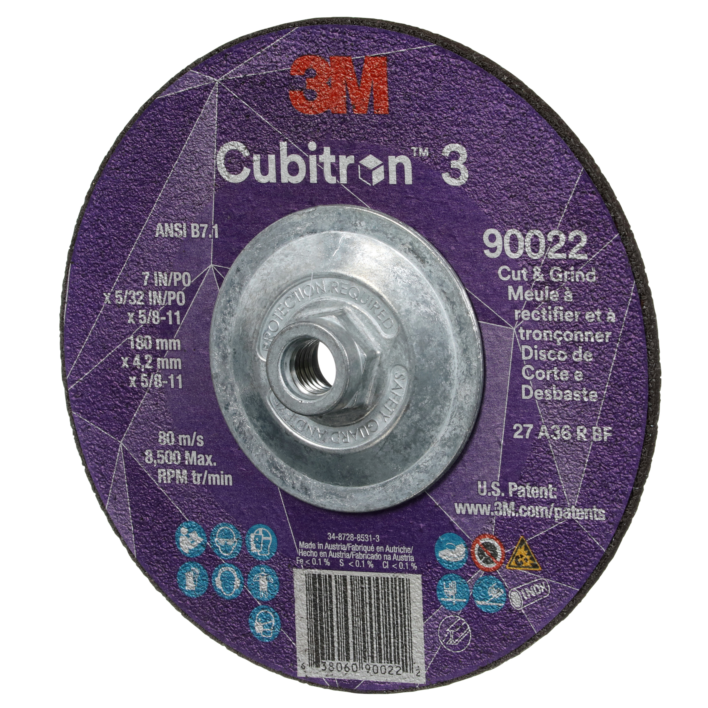 3M™ Cubitron™ 3 Cut and Grind Wheel, 90022, 36+, T27, 7 in x 5/32 in x 5/8 in-11 (180 x 4.2 mm x 5/8-11 in), ANSI, 10 ea/Case