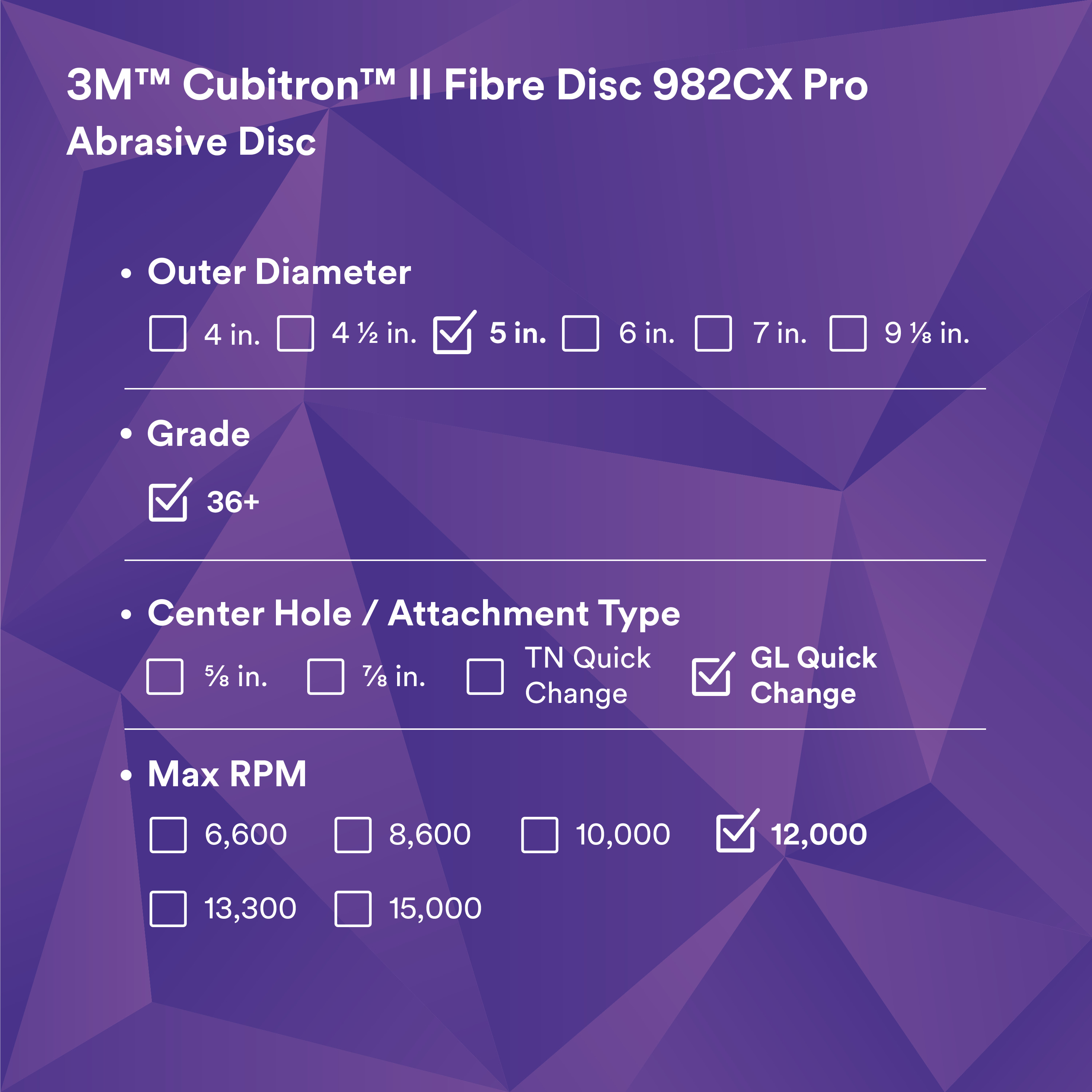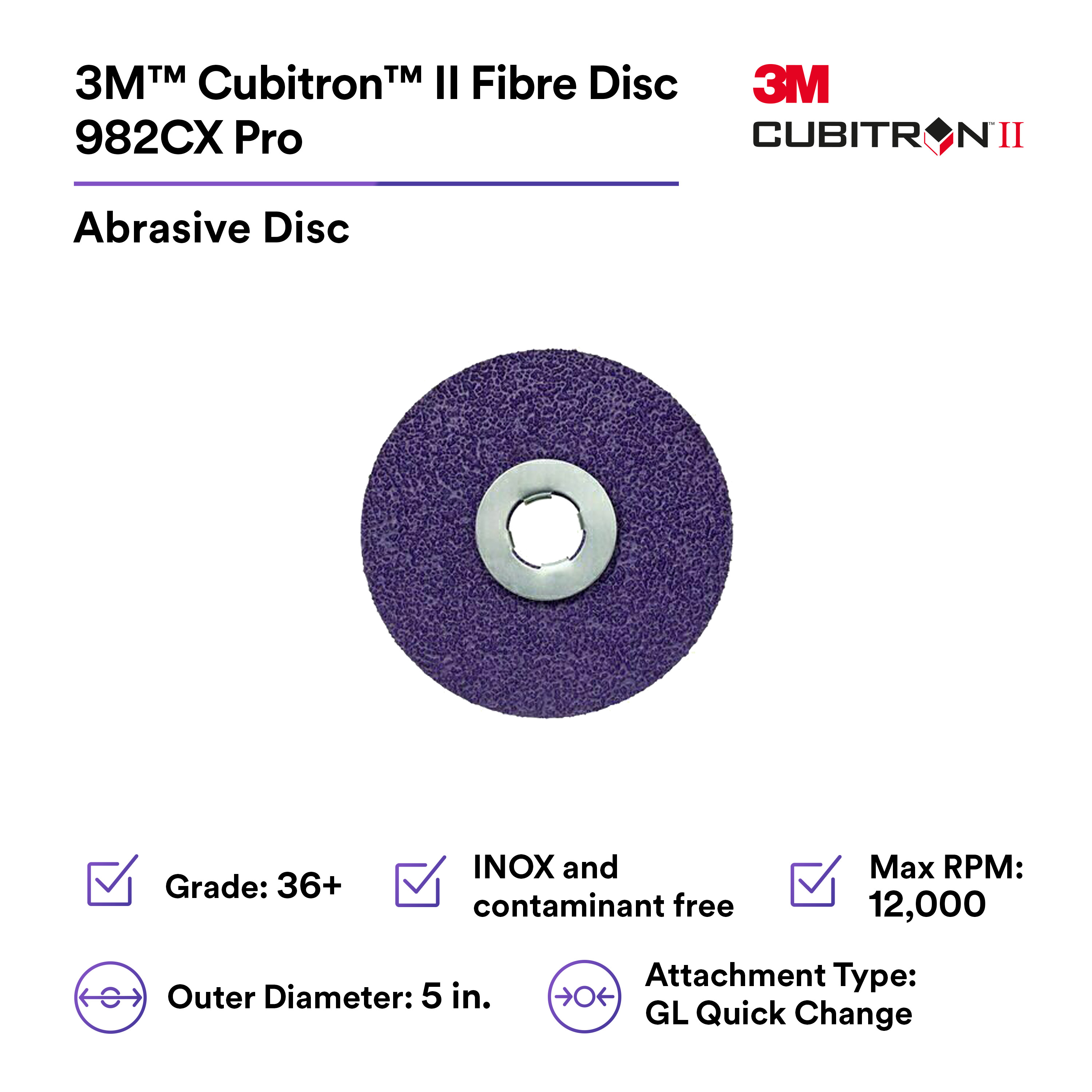3M™ Cubitron™ II Fibre Disc 982CX Pro, 36+, GL Quick Change, 5 in, Die G500P, 25/Bag, 100 ea/Case