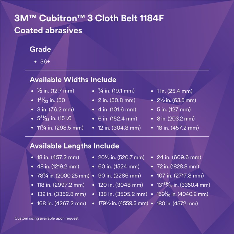 The 3M™ Cubitron™ 3 Cloth Belt 1184F plays a vital role in creating a robust and versatile abrasive solution, to help get your job done, in both manual and automated processes. The performance advantages of the 3M™ Cubitron™ 3 Cloth Belt 1184F are tailored to enhancing and elevating automated grinding, including uptime, throughput, consistency, and efficiency. These four key elements are critical when optimizing your automated abrasive process, and with the 3M™ Cubitron™ 3 Cloth Belt 1184F, you'll experience increases in product life, cut rate, and wear consistency. These features can either enhance processes that are already automated or increase the appeal of automating currently-manual ones. To learn more, connect with 3M’s expert team of Robotic Abrasive Application Engineers — they are ready to partner with you on your automation journey, from idea to implementation.