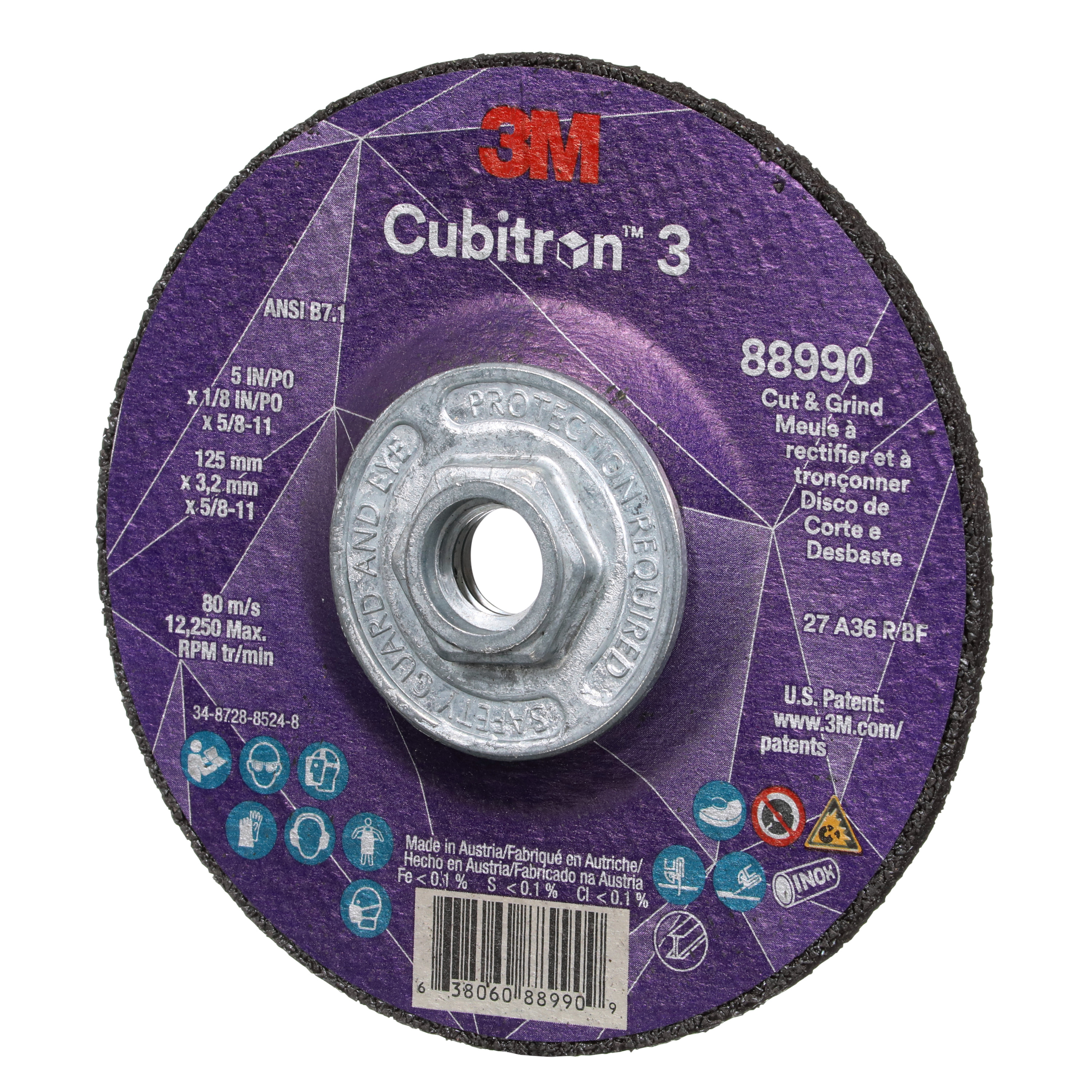 All Products>Abrasives>3M™ Cubitron™ 3 Cut and Grind Wheel, 88990, 36+, T27, 5 in x 1/8 in x 5/8 in-11 (125 x 3.2 mm x 5/8-11 in), ANSI, 10 ea/Case