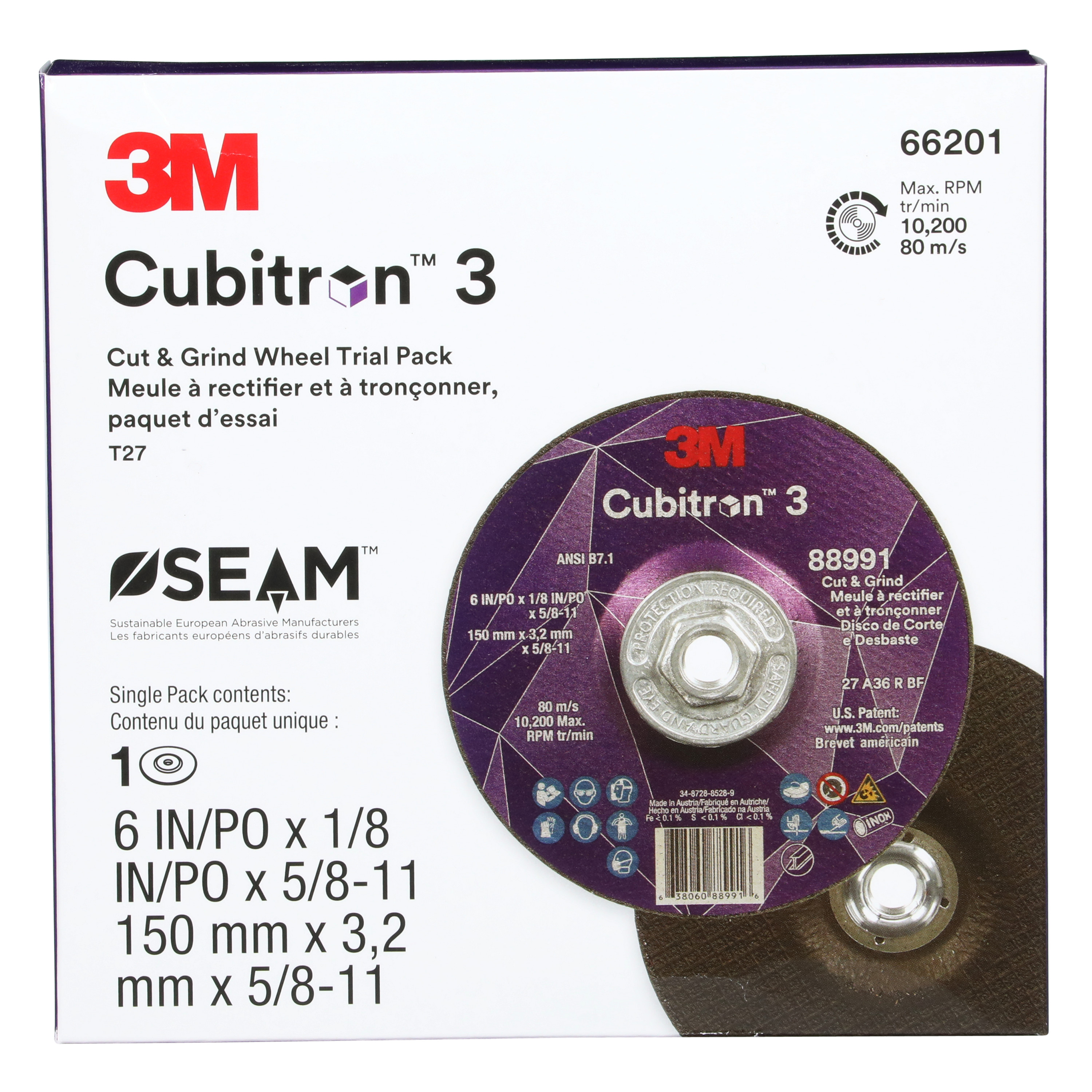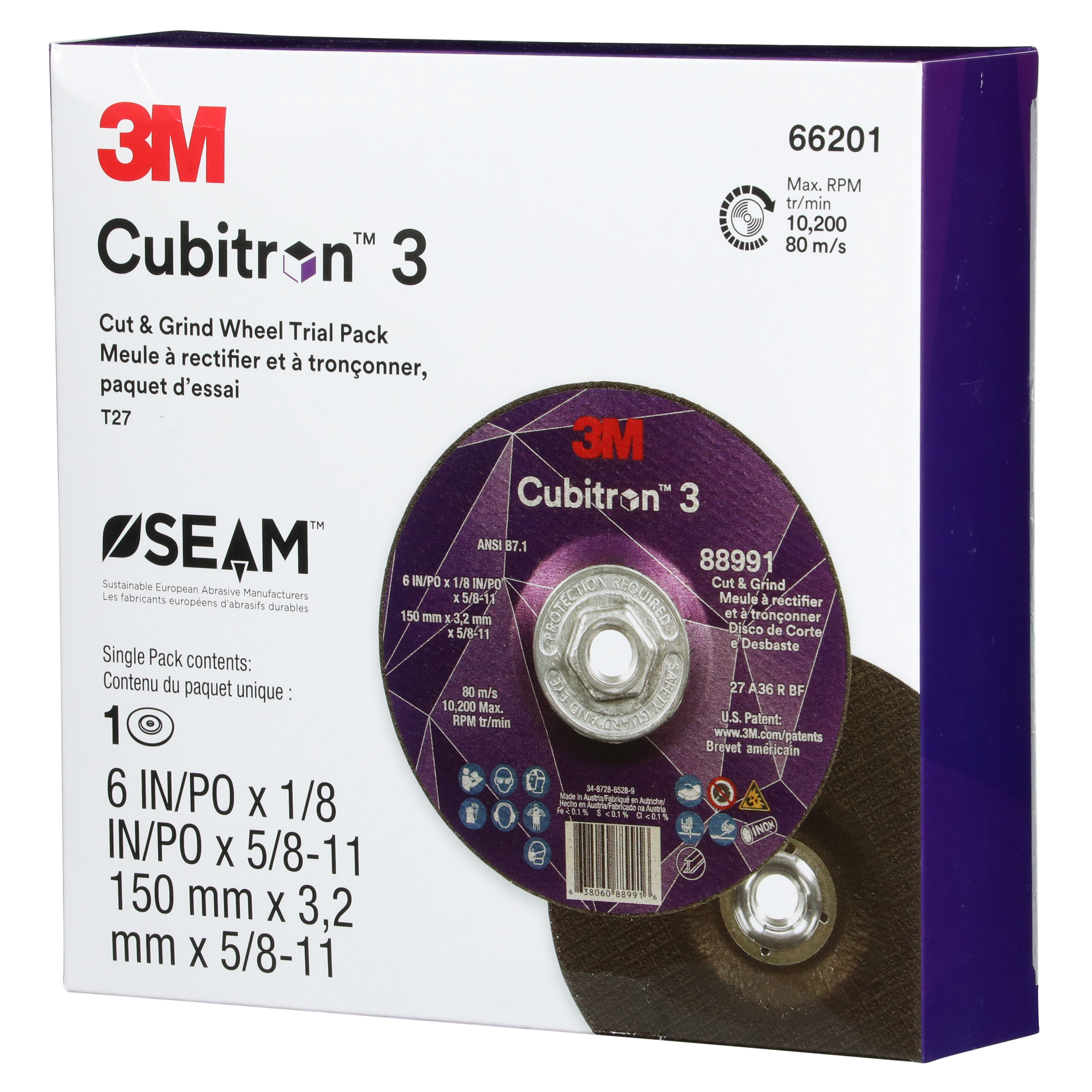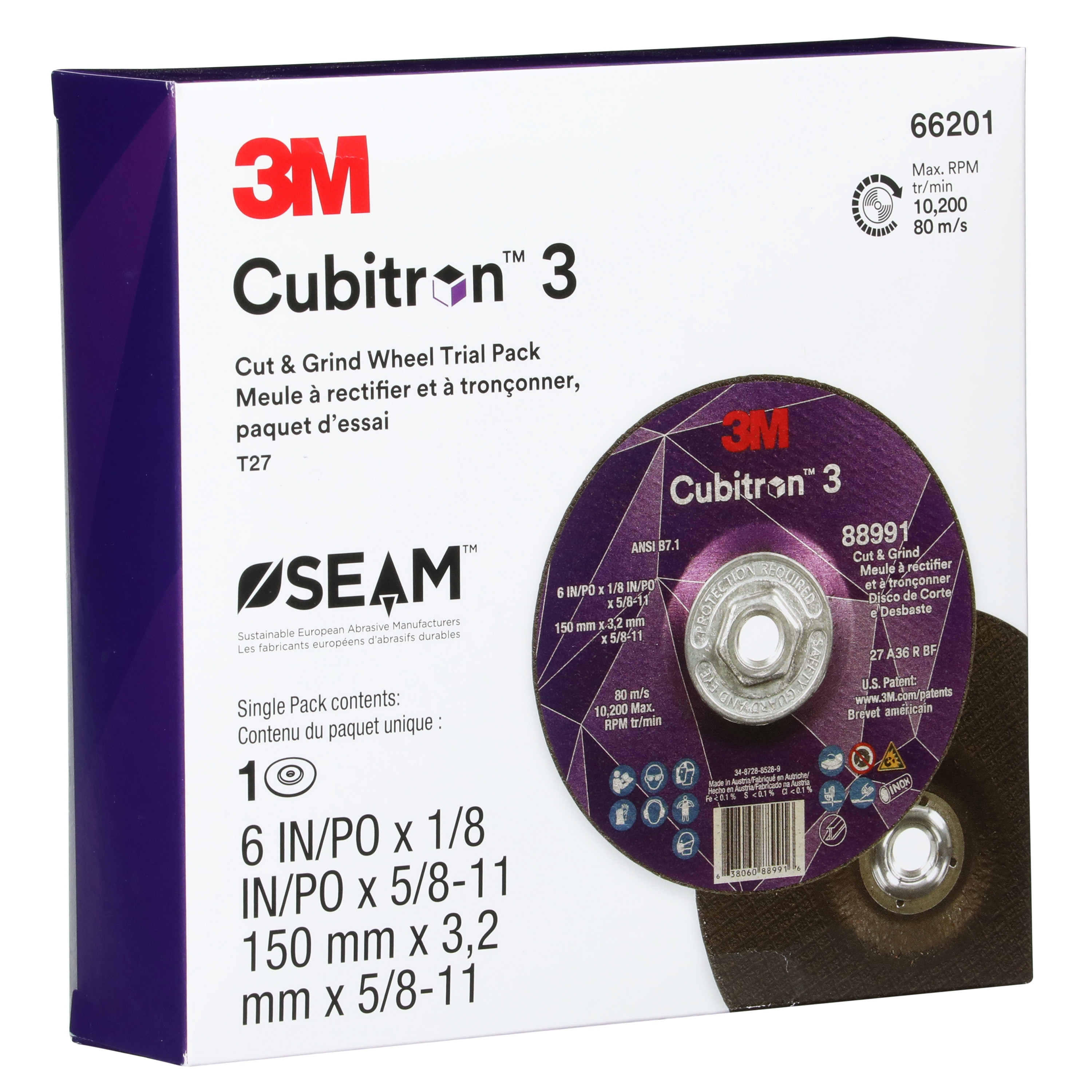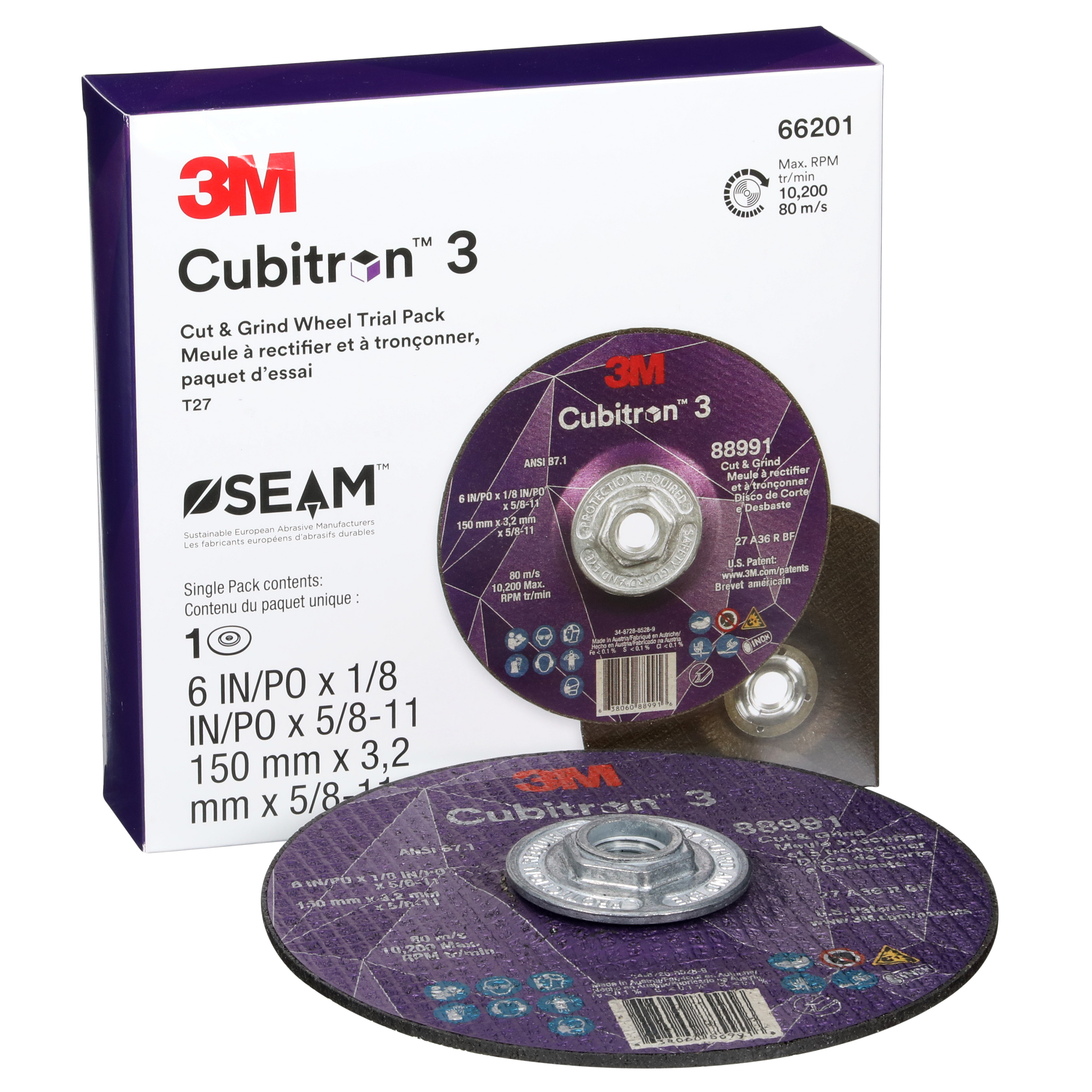 All Products>Abrasives>3M™ Cubitron™ 3 Cut and Grind Wheel, 66201, 36+, Type 27, 6 in x 1/8 in x 5/8 in-11 (150mmx3.2mm), ANSI, 10 ea/Case, Trial Pack