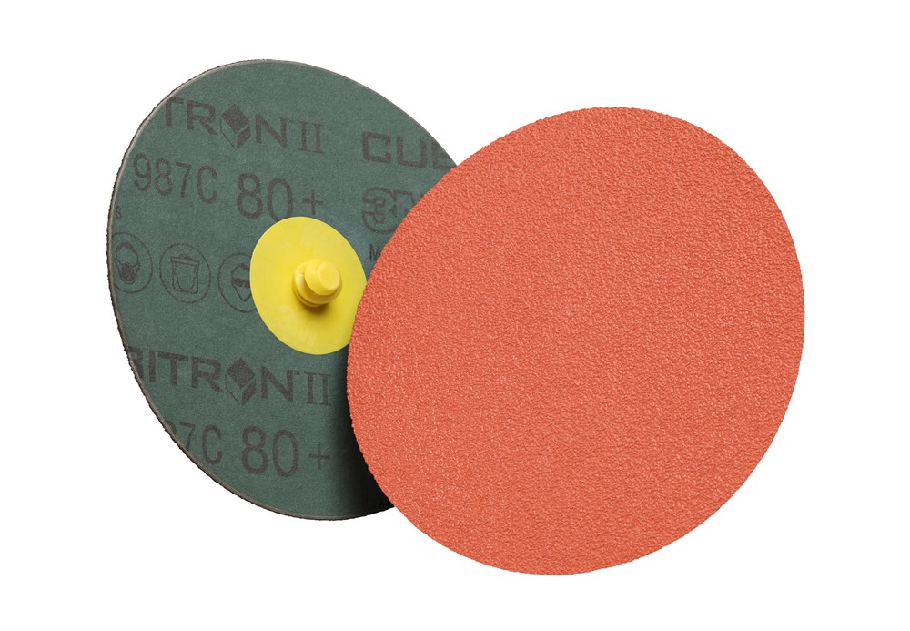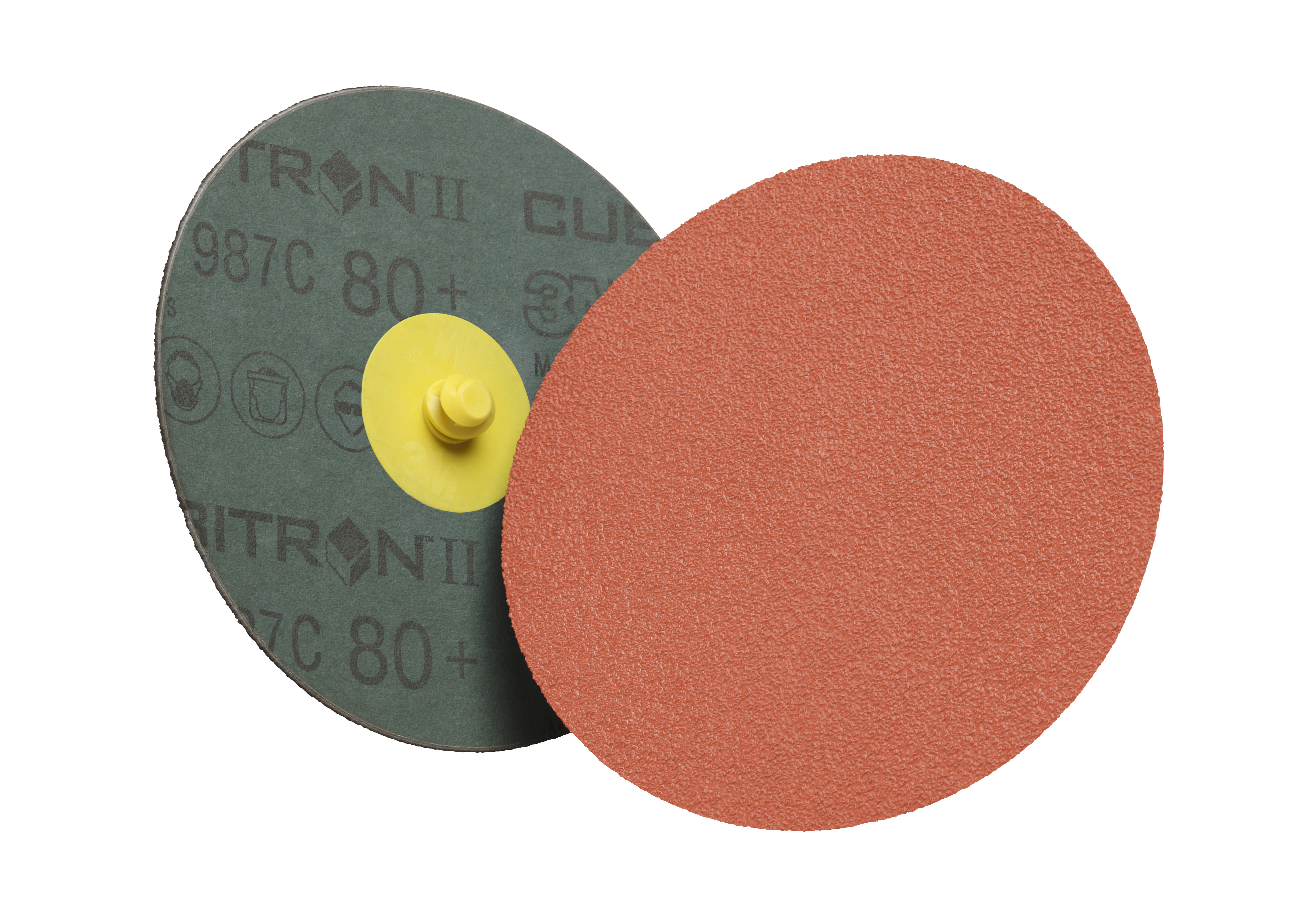 The 3M™ Cubitron™ II Roloc™ Fibre Disc 987C uses precision-shaped grain technology (PSG) for heavy duty metalworking applications. 3M's PSG is an exceptionally high-performing ceramic, resin-bonded to a stiff fiber backing.