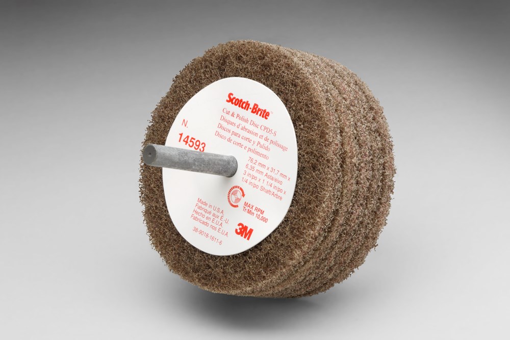 The Scotch-Brite™ Cut and Polish Disc D5 uses a durable, non-woven, open-web construction is load resistant, runs cool, and provides conformability while the aluminum oxide abrasives work to deliver consistent cutting action. The 1/4" shank is suitable for power tools with a 1/4" drive, die grinders, and inline sanders.