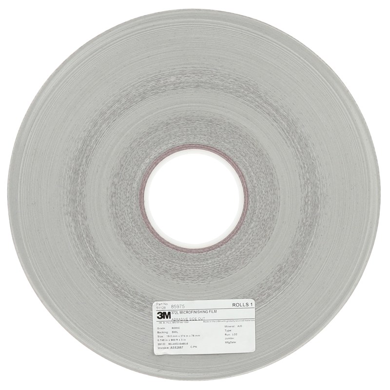 All Products>Abrasives>3M™ Microfinishing Film Roll 372L, 30 Mic 5MIL, 0.709 in x 300 ft x 3 in (18.01mmx91.5m), Cardboard Core, ASO, 17 ea/Case