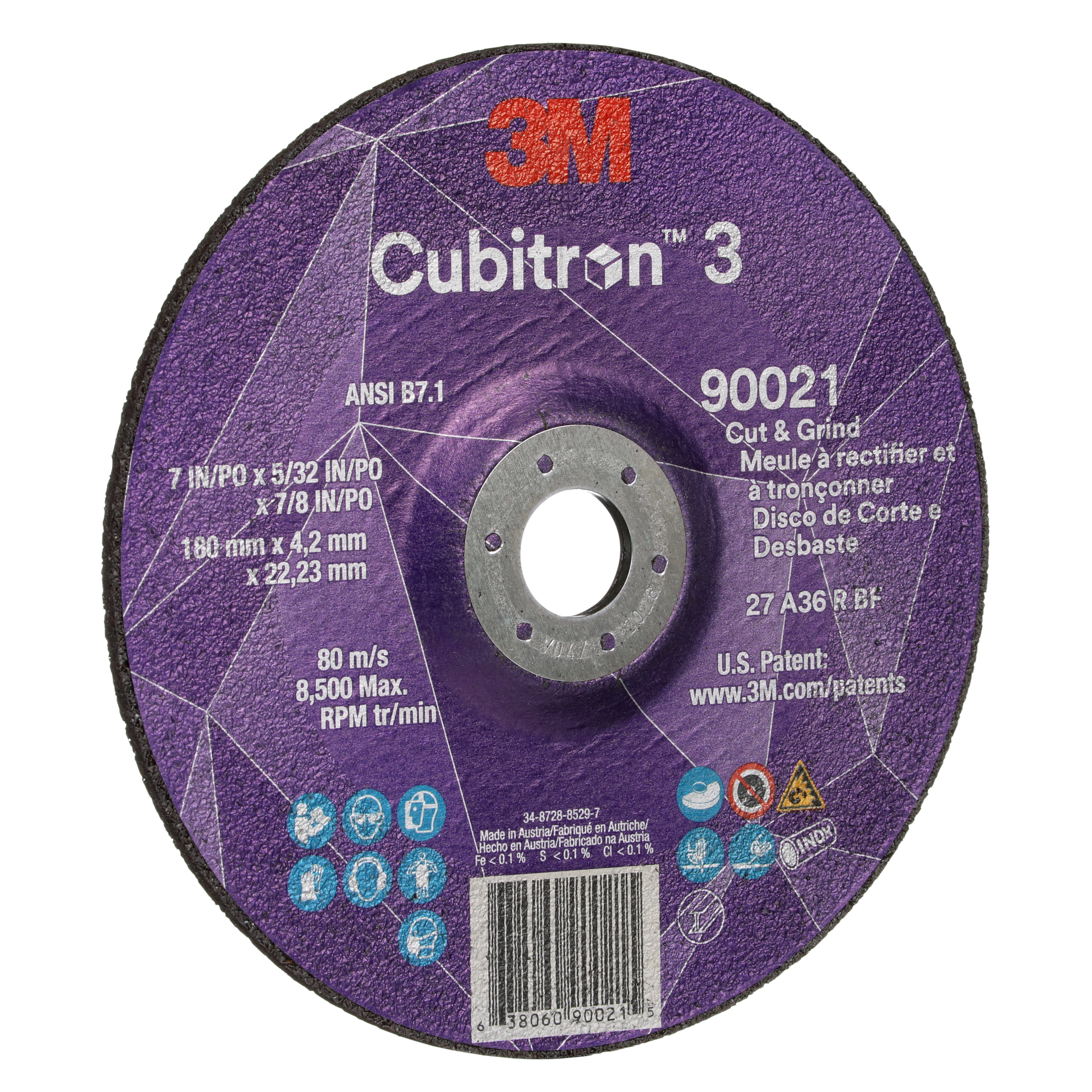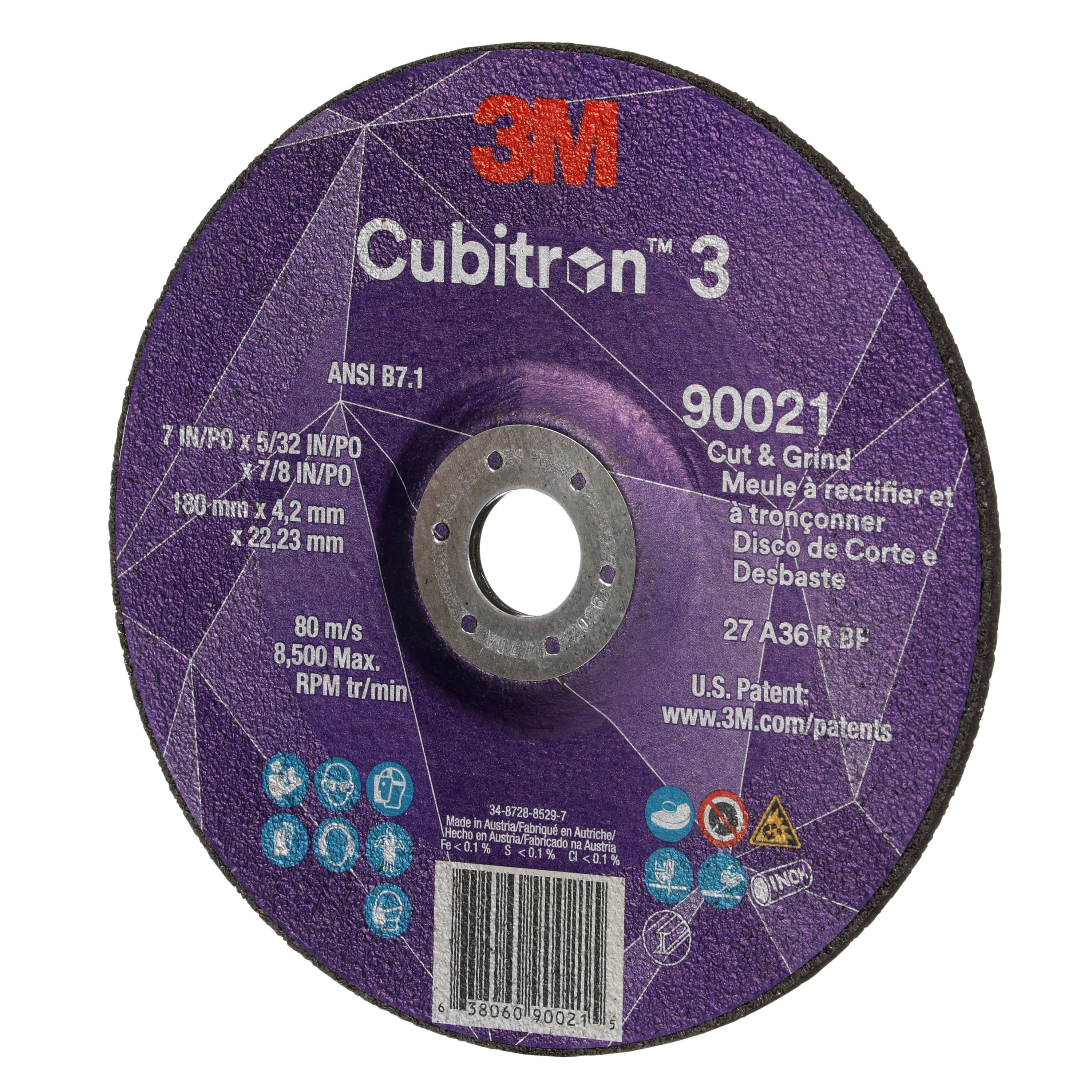 All Products>Abrasives>3M™ Cubitron™ 3 Cut and Grind Wheel, 90021, 36+, T27, 7 in x 5/32 in x 7/8 in (180 x 4.2 x 22.23 mm), ANSI, 10/Pack, 20 ea/Case