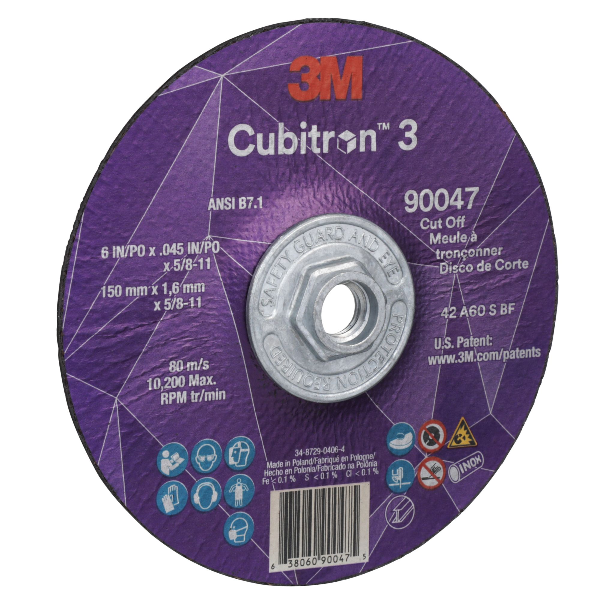 All Products>Abrasives>3M™ Cubitron™ 3 Cut-Off Wheel, 90047, 60+, T27, 6 in x 0.045 in x 5/8 in-11 (150 x 1.6 mm x 5/8-11 in), ANSI, 10 ea/Case