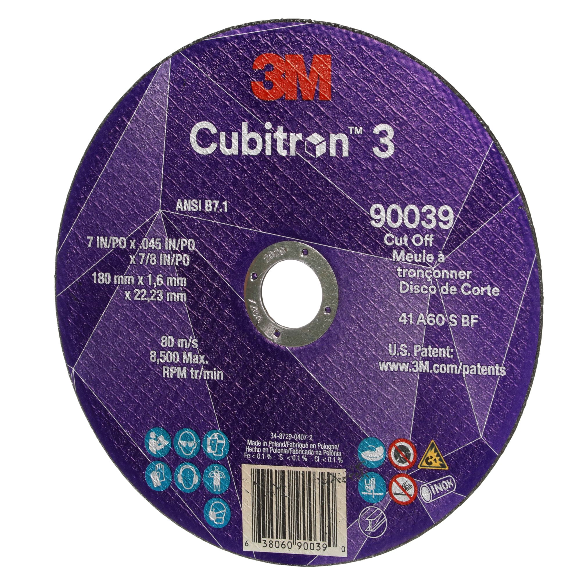 All Products>Abrasives>3M™ Cubitron™ 3 Cut-Off Wheel, 90039, 60+, T1, 7 in x 0.45 in x 7/8 in(180 x 1.6 x 22.23 mm), ANSI, 25/Pack, 50 ea/Case