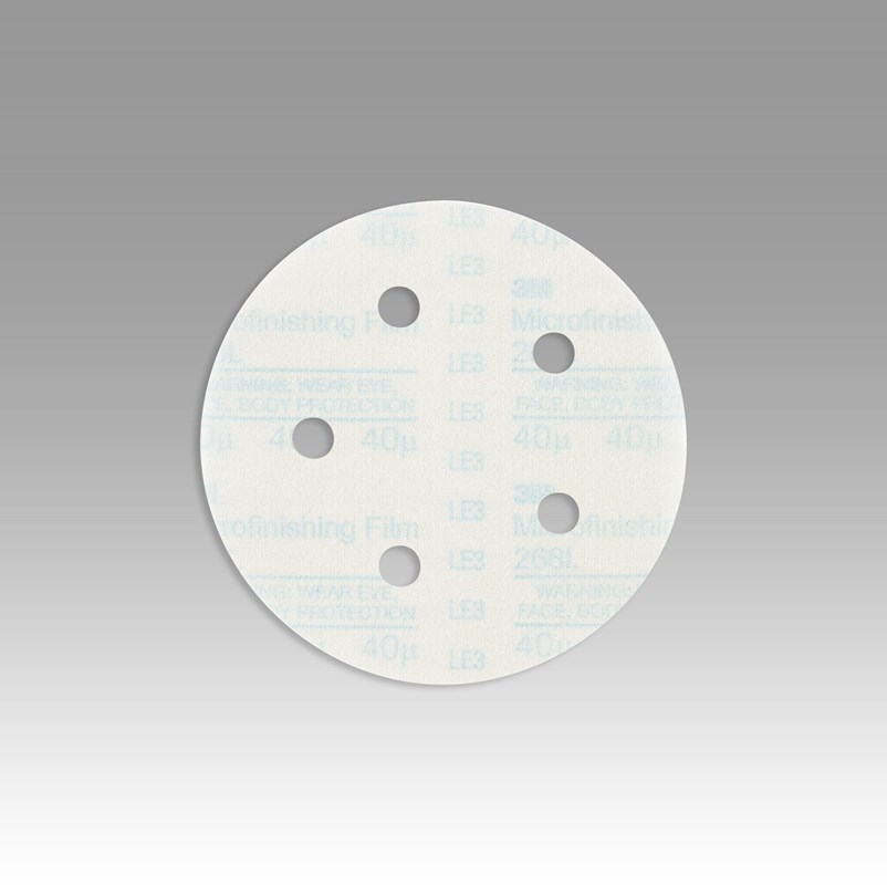 3M™ Hookit™ Microfinishing Film Disc 268L, 40 Mic 3MIL, Type D, 5 in x NH, D/F 5HL, Die 500FH, 25/Bag, 500 ea/Case