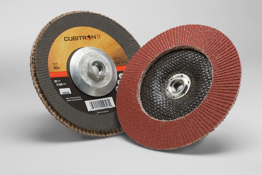 The Anatomy of a Versatile, Medium-Duty Disc3M™ Cubitron™ II Flap Disc 967A – powered by 3M Precision-Shaped Grain and a poly-cotton backing – is well-suited for medium-duty applications including weld, scale and oxide removal, light deburring, surface preparation and blending. Along with the poly-cotton backing, this disc also features an incorporated grinding aid to help it run cool and cut efficiently on heat-sensitive metals. This all adds up to a disc that strikes a balance of fast cut and long life. Flap Disc DesignFlap discs are the ideal choice for a wide range of applications on a variety of metals. The abrasive flaps offer a long-lasting supply of fresh abrasives in a load-resistant design. Designed for use with a right-angle grinder, flap discs allow you to breeze through a wide range of applications with less chance of gouging – even for less-experienced grinders. Powered by 3M Precision-Shaped Grain3M™ Cubitron™ II Flap Disc 967A features proprietary 3M Precision-Shaped – a grain design that continually fractures into sharp points that slice cleanly through metal, unlike traditional abrasives which tend to plow through the substrate. The grains fracture evenly and continuously expose new sharp edges to keep the disc cutting efficiently. The result is that 3M™ Cubitron™ II products out-cut and outlast conventional ceramic industrial abrasives. Applications