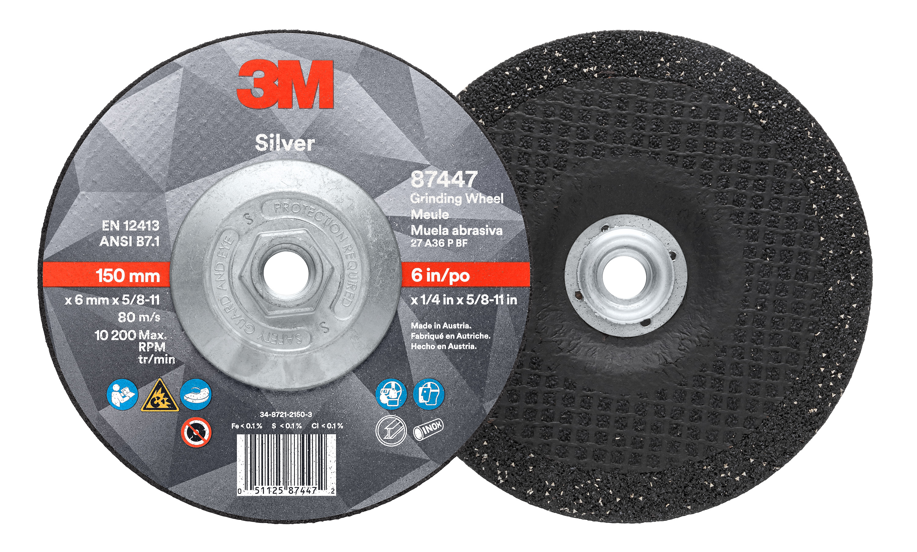 All Products>Abrasives>3M™ Silver Depressed Center Grinding Wheel, 87450, 36+, T27, 6 in x 1/4 in x 7/8 in, 10/Carton, 20 ea/Case