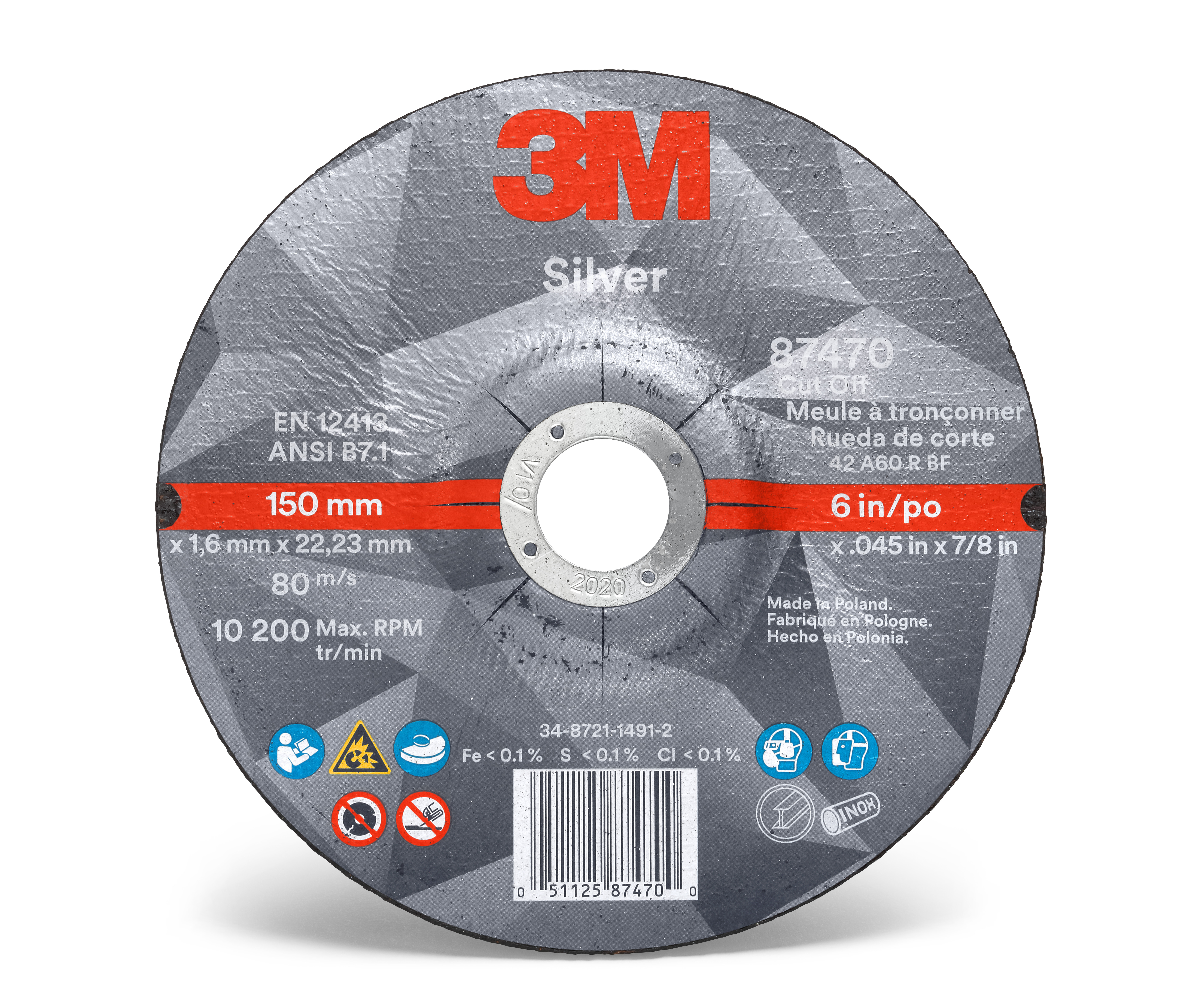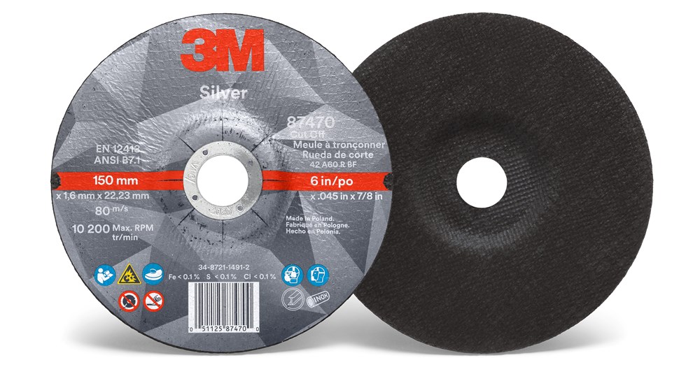 All Products>Abrasives>3M™ Silver Cut-Off Wheel, 87470, 36+, T27, 6 in x 0.045 in x 7/8 in, 25/Carton, 50 ea/Case
