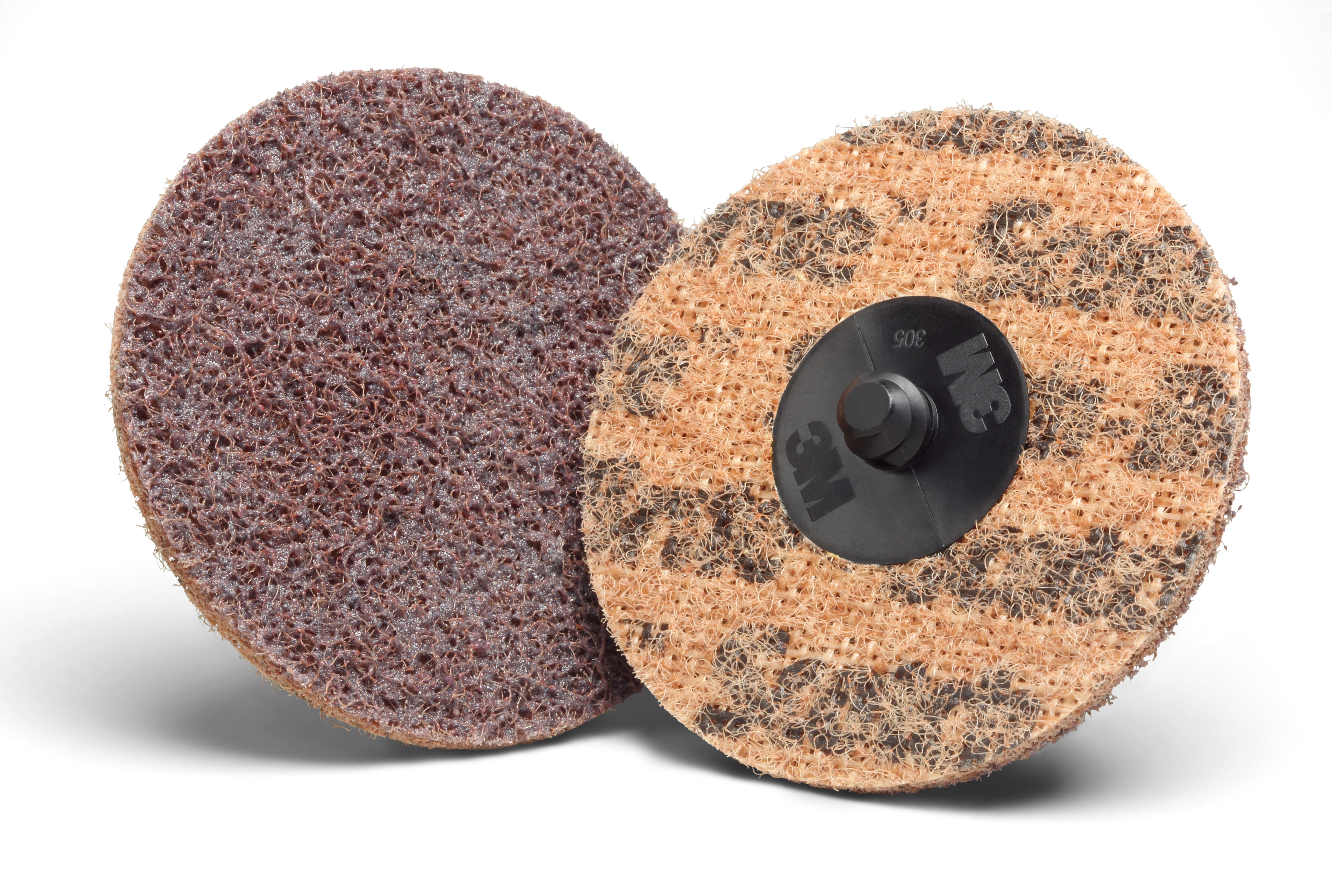 Scotch-Brite™ surface conditioning products were developed with abrasives incorporated into non-woven nylon or synthetic fibers. Combining abrasives with the fibers creates an abrasive system that delivers consistent results for the life of the product. The open-web material runs cool, reducing the risk of part discoloration and warping. The fibers are load resistant and keep the abrasive minerals cutting at high performance by limiting clogging of the fibers, which also extends the life of the disc.