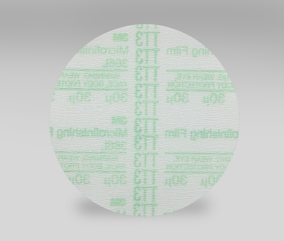 The 3M™ Hookit™ Microfinishing Film Disc 366L features precision, micron-graded aluminum oxide, which is a popular choice among industrial professionals because of its fast cut-rate and long life. This mineral makes a tough, durable abrasive that self-fractures to expose fresh cutting edges, whereas traditional natural abrasives dull more quickly. Due to its fast cut-rate, hardness, and strength, it is widely used in grinding applications in addition to sanding and finishing applications. Aluminum oxide is suitable for a wide variety of materials in both woodworking and metalworking, including ferrous alloys.