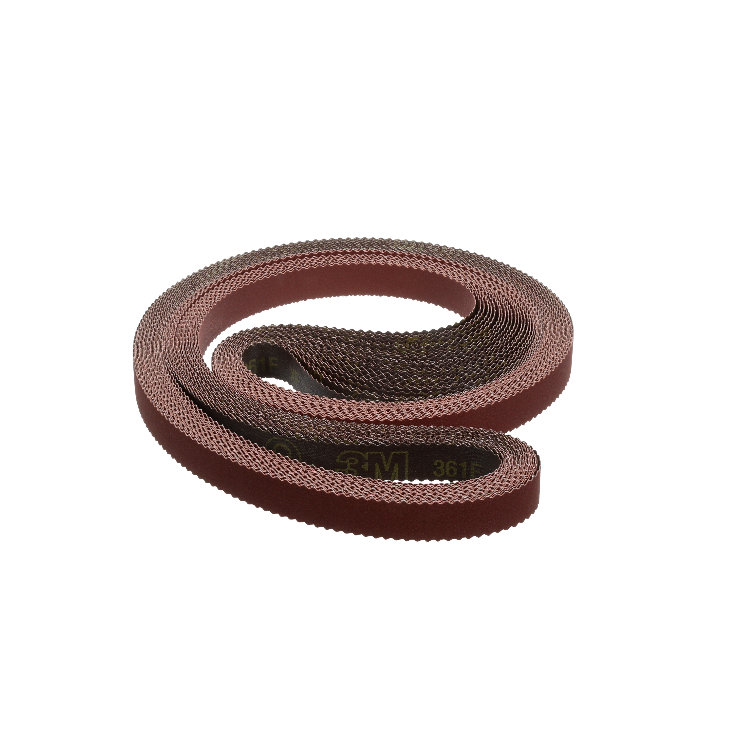 3M™ Cloth Belt 361F comes with fast-cutting aluminum oxide abrasive grains bonded to heavy polyester cloth backing. Its durable, heat-resistant resin supports both wet and dry applications. Grades of P100 and lower are backed with YF-weight polyester, and grades higher than P100 are backed with slightly less stiff XF-weight polyester.