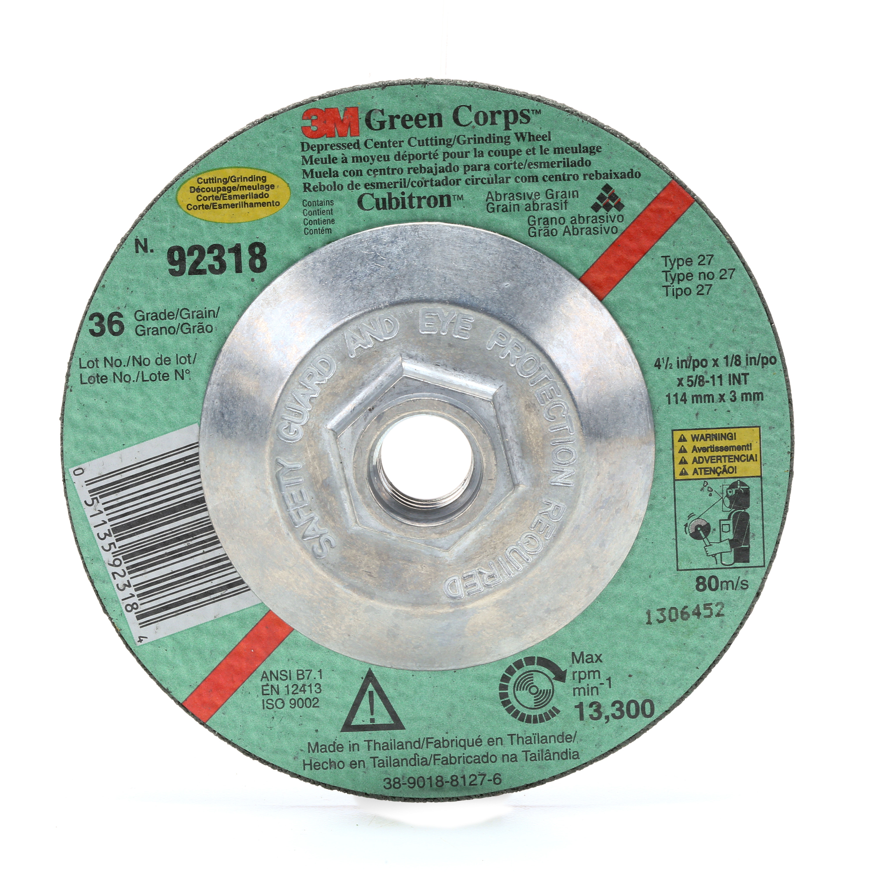All Products>Abrasives>3M™ Green Corps™ Cutting/Grinding Wheel, T27, 36, 4-1/2 in x 1/8 in x 5/8 in-11 Internal, 10/Carton, 40 ea/Case