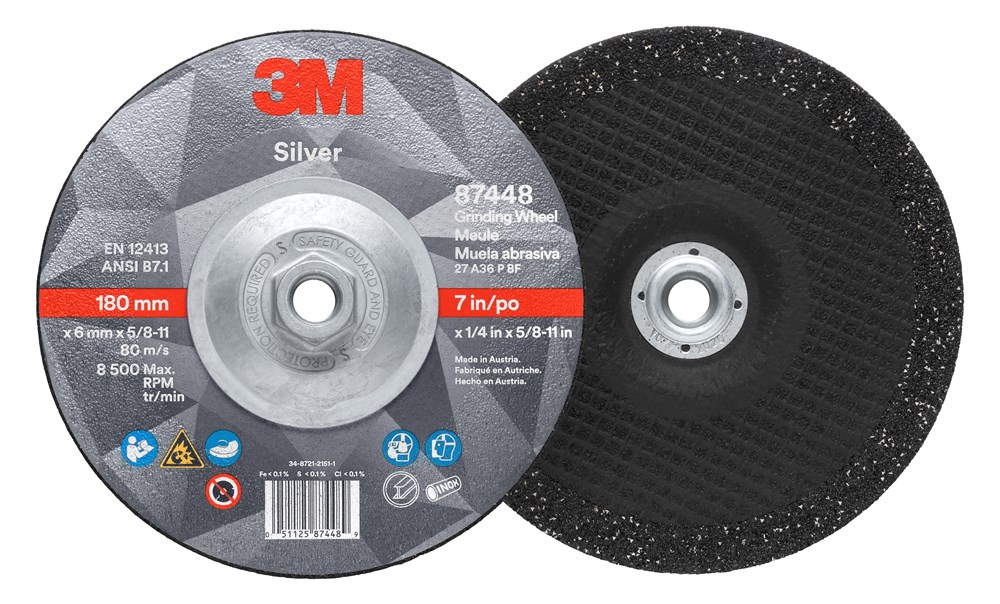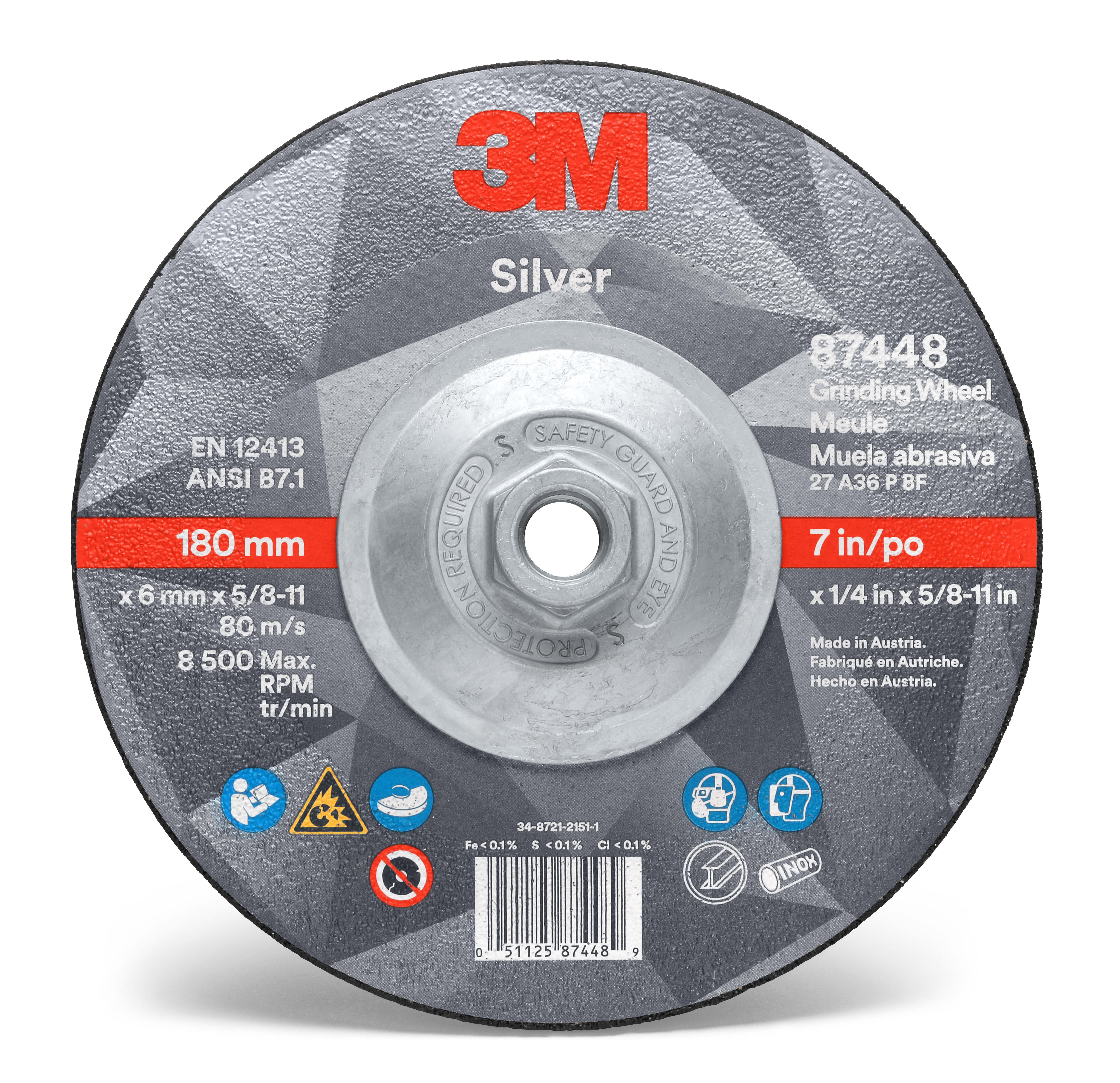 All Products>Abrasives>3M™ Silver Depressed Center Grinding Wheel, 87448, 36+, T27 Quick Change, 7 in x 1/4 in x 5/8 in-11, 10/Carton, 20 ea/Case