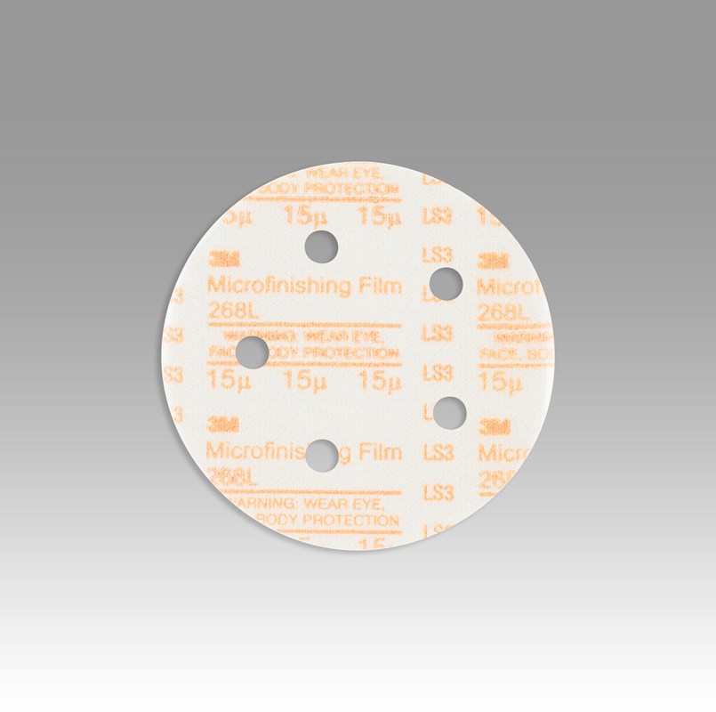 3M™ Hookit™ Microfinishing Film Disc 268L, 15 Mic 3MIL, Type D, 5 in x NH, D/F 5HL, Die 500FH, 25/Bag, 500 ea/Case