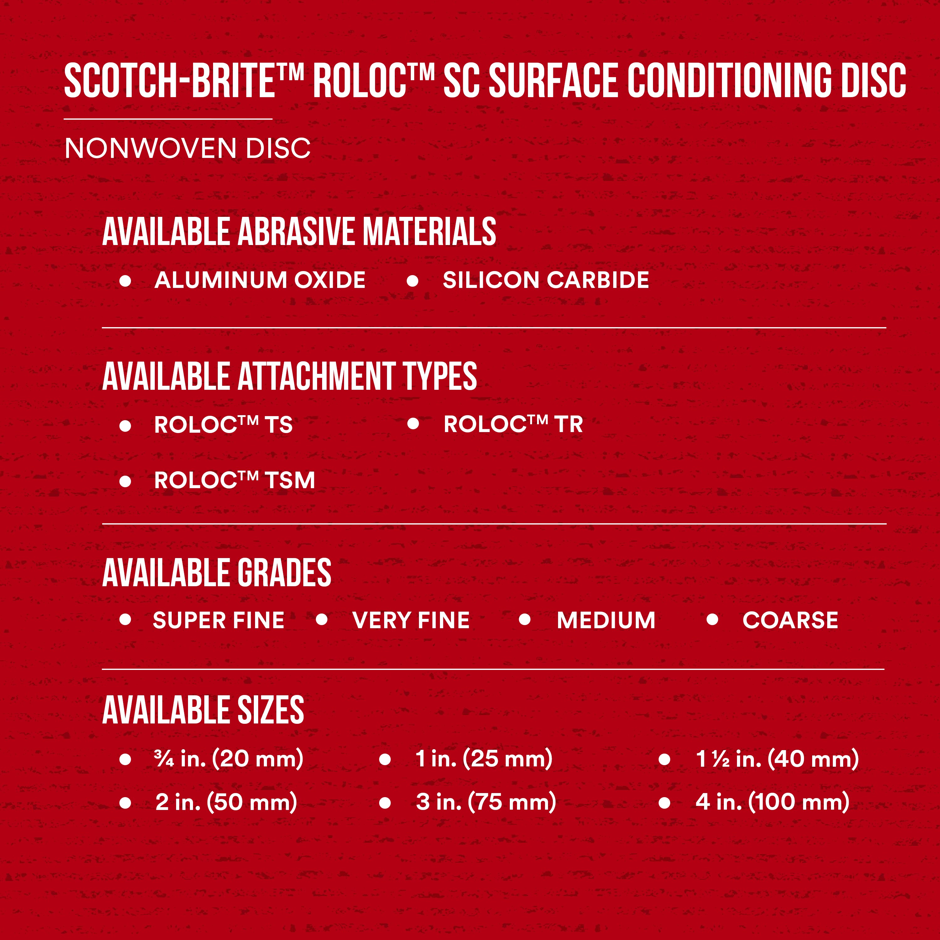 Scotch-Brite Roloc Surface Conditioning Discs SC combine the cutting efficiency of a nonwoven disc with the changeover speed of the 3M Roloc Quick-Change Attachment System. These discs use an open web fiber that runs cool, reducing the risk of substrate discoloration and warping, while remaining load resistant to keep the abrasive minerals cutting at high performance. This helps limit clogging, extending the disc's work life in a range of tasks. These features make Scotch-Brite Roloc Surface Conditioning Discs SC a versatile, reliable solution for a variety of applications.