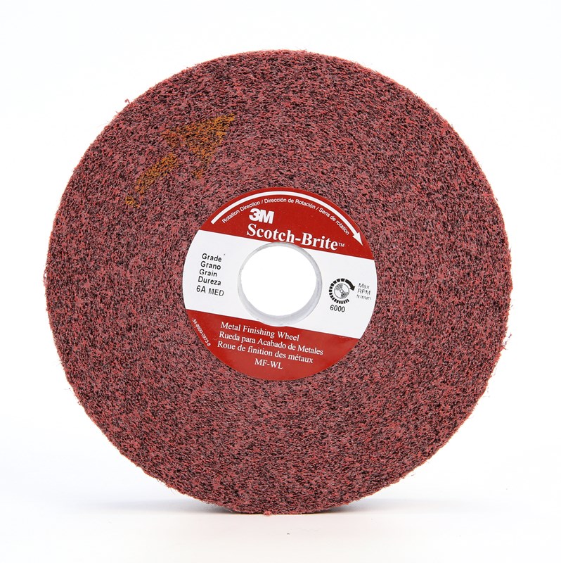 On softer metals like aluminum, copper, and brass, Scotch-Brite™ Metal Finishing Wheels are used to blend out minor surface imperfections and handling marks while providing the desired decorative finish on products such as builder's hardware, and plumbing fixtures. Typically used on stationary machinery, the wheels are available in diameters of 6 to 16 inches and widths of 1/2 inch and greater. This highly conformable wheel is convolutely wound on a core to run smoothly and help create professional finishing results. Available in grade CRS and MED.
